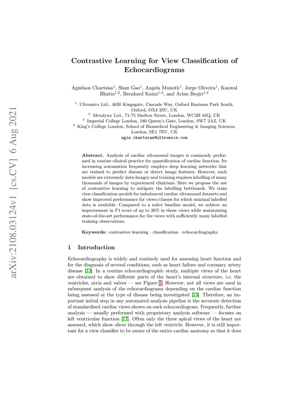 Analysis of cardiac ultrasound images is commonly performed in routine clinical practice for quantification of cardiac function. Its increasing automation frequently employs deep learning networks that are trained to predict disease or detect image features. However, such models are extremely data-hungry and training requires labelling of many thousands of images by experienced clinicians. Here we propose the use of contrastive learning to mitigate the labelling bottleneck. We train view classification models for imbalanced cardiac ultrasound datasets and show improved performance for views/classes for which minimal labelled data is available. Compared to a naive baseline model, we achieve an improvement in F1 score of up to 26% in those views while maintaining state-of-the-art performance for the views with sufficiently many labelled training observations.