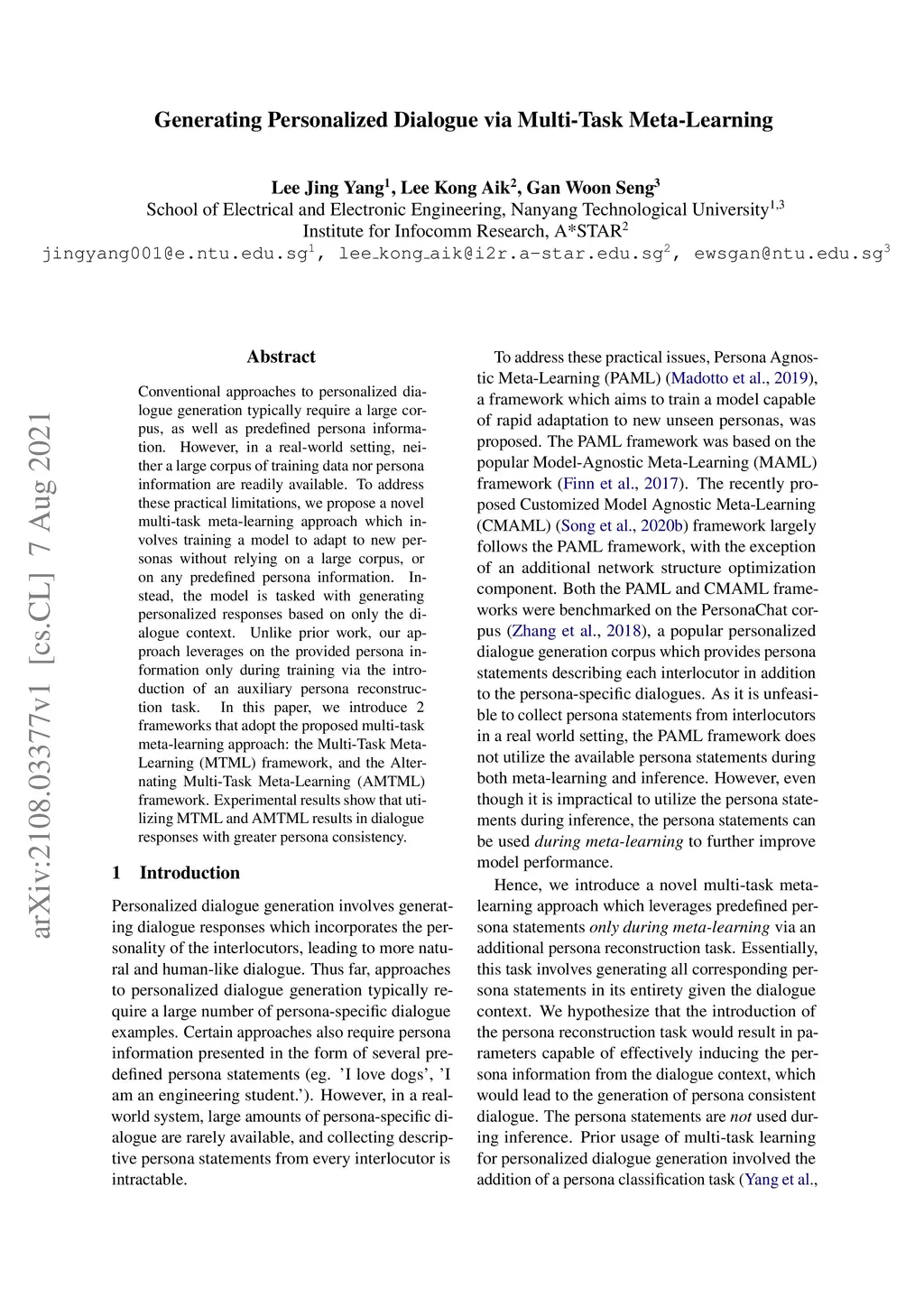 Generating Personalized Dialogue via Multi-Task Meta-Learning