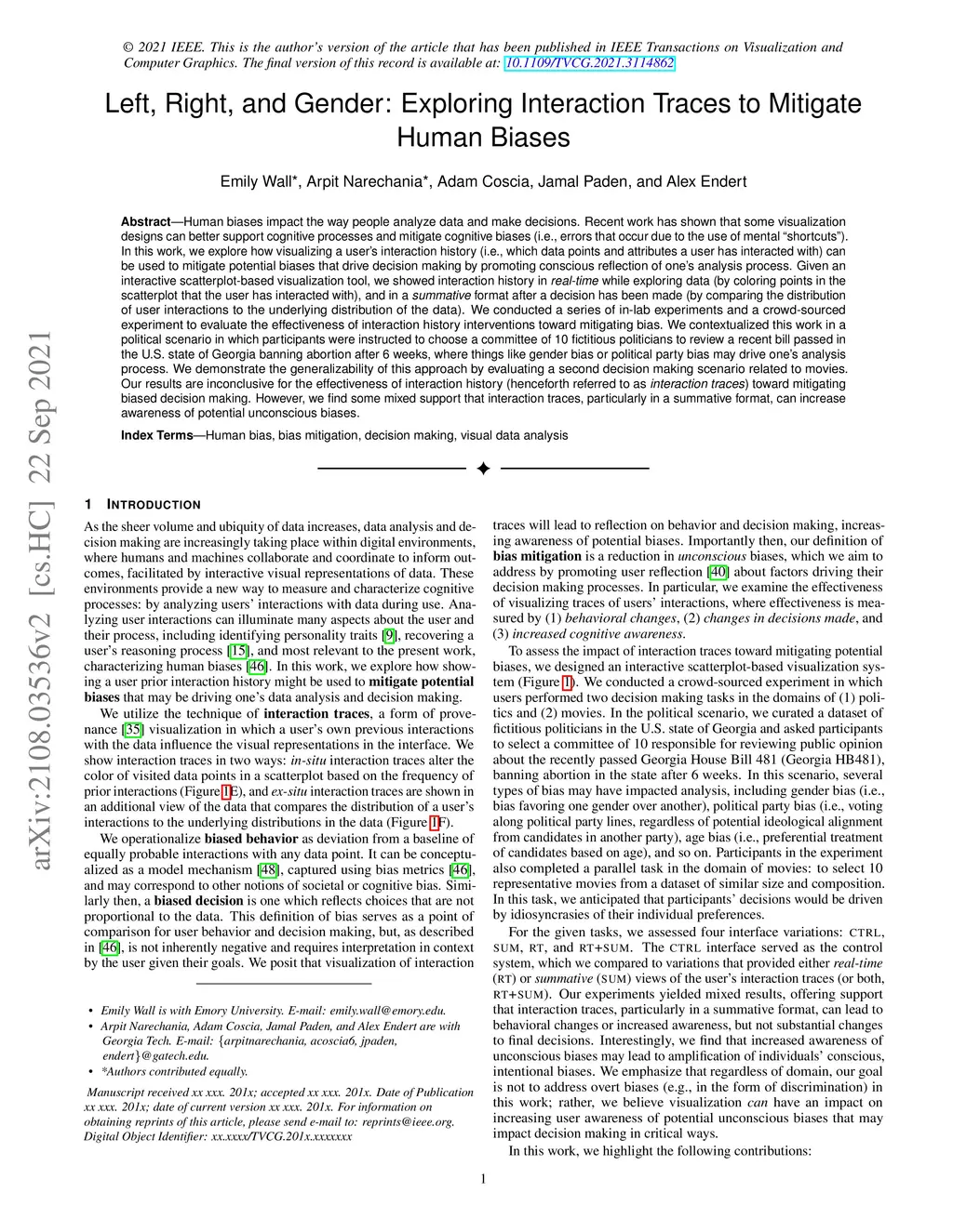 Human biases impact the way people analyze data and make decisions. Recent work has shown that some visualization designs can better support cognitive processes and mitigate cognitive biases (i.e., errors that occur due to the use of mental "shortcuts"). In this work, we explore how visualizing a user's interaction history (i.e., which data points and attributes a user has interacted with) can be used to mitigate potential biases that drive decision making by promoting conscious reflection of one's analysis process. Given an interactive scatterplot-based visualization tool, we showed interaction history in real-time while exploring data (by coloring points in the scatterplot that the user has interacted with), and in a summative format after a decision has been made (by comparing the distribution of user interactions to the underlying distribution of the data). We conducted a series of in-lab experiments and a crowd-sourced experiment to evaluate the effectiveness of interaction history interventions toward mitigating bias. We contextualized this work in a political scenario in which participants were instructed to choose a committee of 10 fictitious politicians to review a recent bill passed in the U.S. state of Georgia banning abortion after 6 weeks, where things like gender bias or political party bias may drive one's analysis process. We demonstrate the generalizability of this approach by evaluating a second decision making scenario related to movies. Our results are inconclusive for the effectiveness of interaction history (henceforth referred to as interaction traces) toward mitigating biased decision making. However, we find some mixed support that interaction traces, particularly in a summative format, can increase awareness of potential unconscious biases.