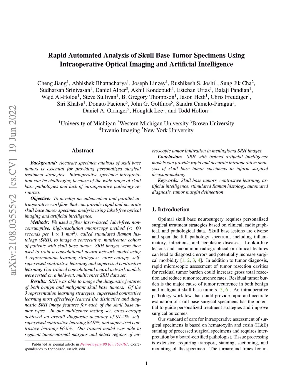 Rapid Automated Analysis of Skull Base Tumor Specimens Using
