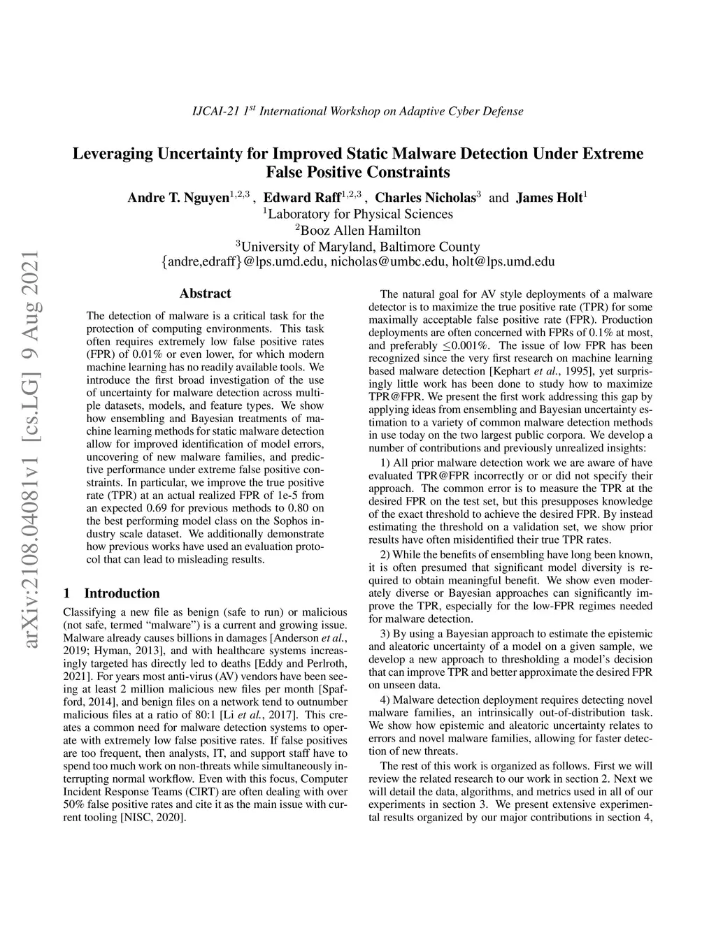 The detection of malware is a critical task for the protection of computing environments. This task often requires extremely low false positive rates (FPR) of 0.01% or even lower, for which modern machine learning has no readily available tools. We introduce the first broad investigation of the use of uncertainty for malware detection across multiple datasets, models, and feature types. We show how ensembling and Bayesian treatments of machine learning methods for static malware detection allow for improved identification of model errors, uncovering of new malware families, and predictive performance under extreme false positive constraints. In particular, we improve the true positive rate (TPR) at an actual realized FPR of 1e-5 from an expected 0.69 for previous methods to 0.80 on the best performing model class on the Sophos industry scale dataset. We additionally demonstrate how previous works have used an evaluation protocol that can lead to misleading results.