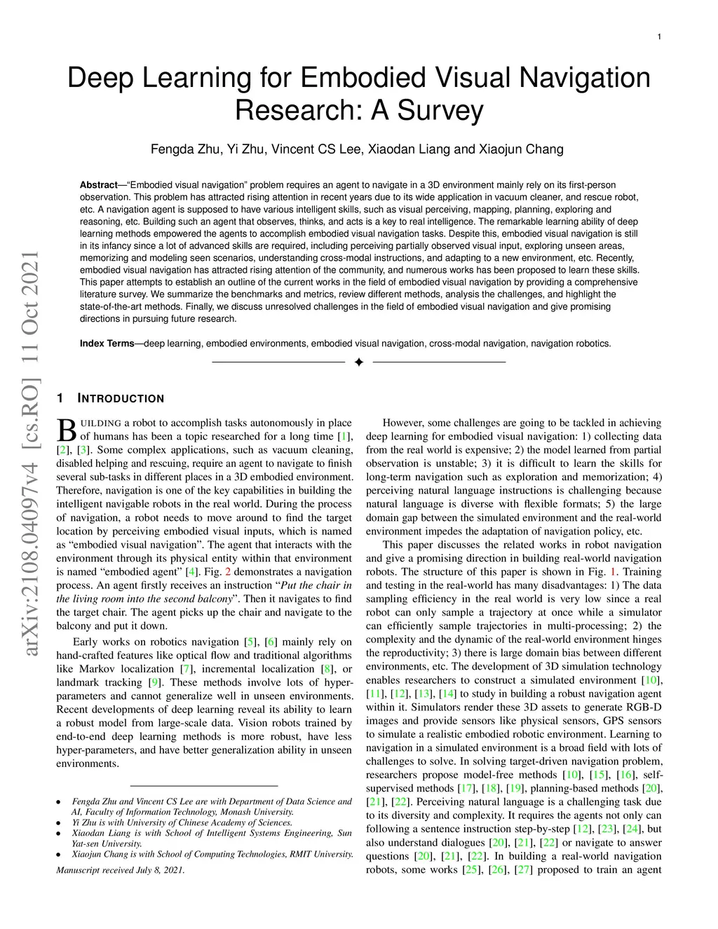 Deep Learning for Embodied Vision Navigation: A Survey
