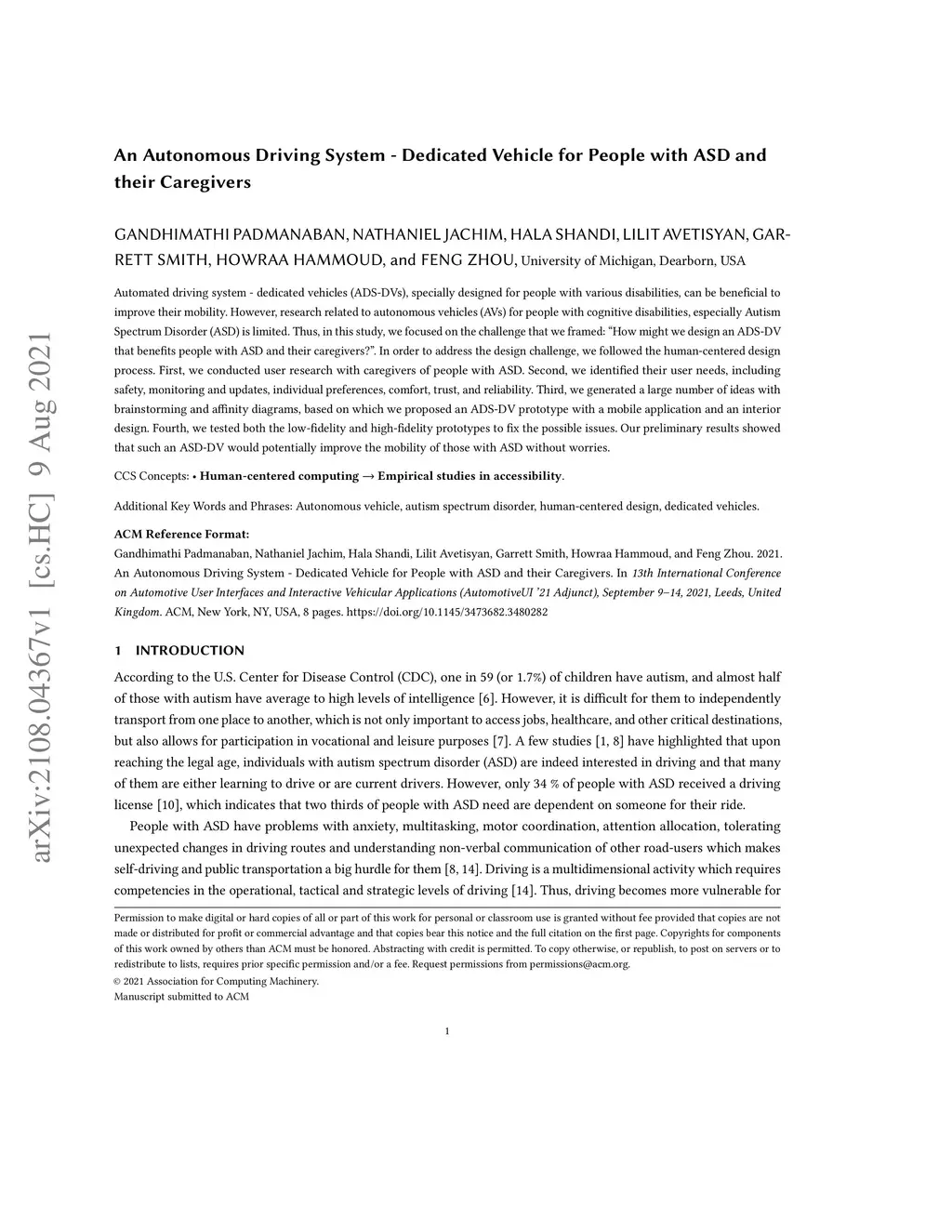 An Autonomous Driving System - Dedicated Vehicle for People with ASD and
