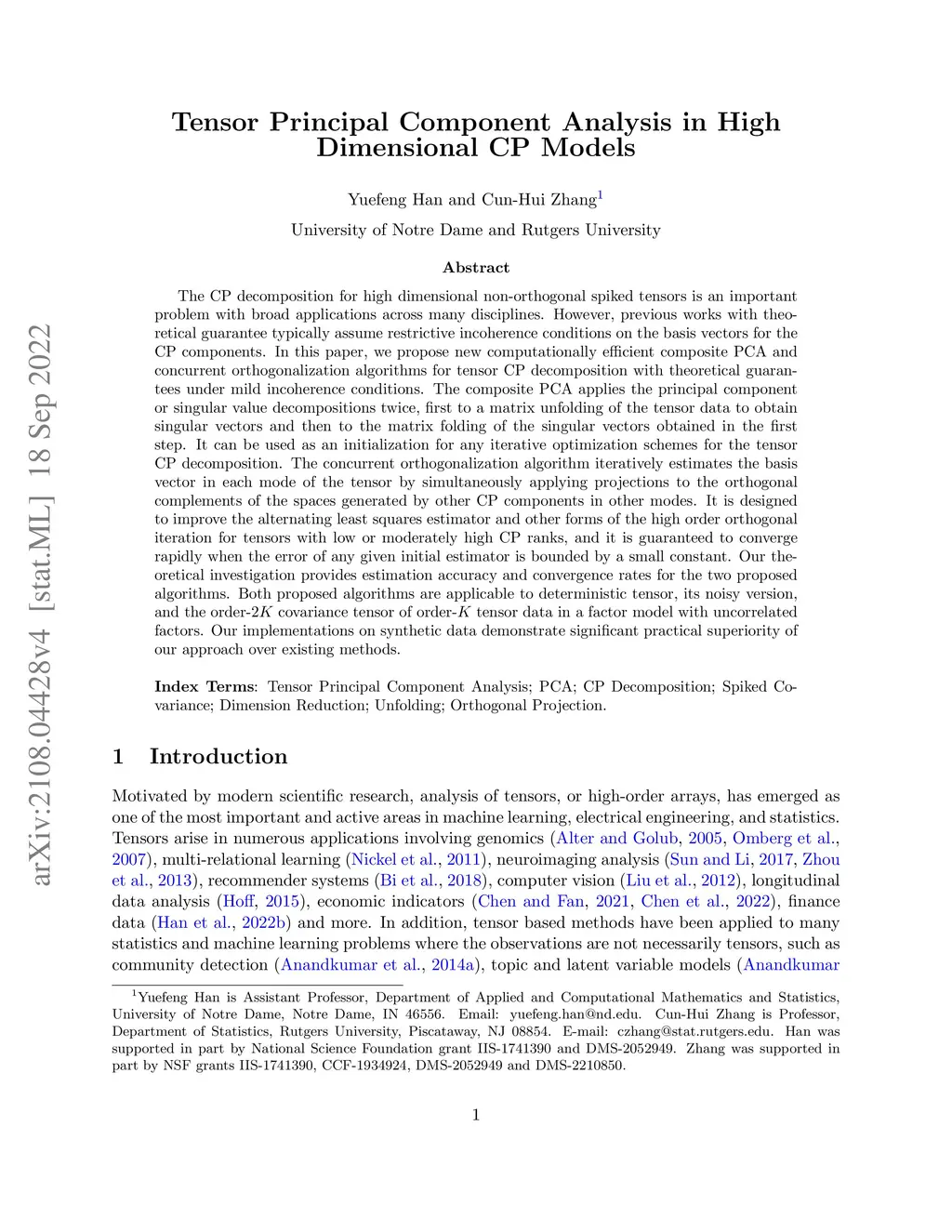 The CP decomposition for high dimensional non-orthogonal spiked tensors is an important problem with broad applications across many disciplines. However, previous works with theoretical guarantee typically assume restrictive incoherence conditions on the basis vectors for the CP components. In this paper, we propose new computationally efficient composite PCA and concurrent orthogonalization algorithms for tensor CP decomposition with theoretical guarantees under mild incoherence conditions. The composite PCA applies the principal component or singular value decompositions twice, first to a matrix unfolding of the tensor data to obtain singular vectors and then to the matrix folding of the singular vectors obtained in the first step. It can be used as an initialization for any iterative optimization schemes for the tensor CP decomposition. The concurrent orthogonalization algorithm iteratively estimates the basis vector in each mode of the tensor by simultaneously applying projections to the orthogonal complements of the spaces generated by other CP components in other modes. It is designed to improve the alternating least squares estimator and other forms of the high order orthogonal iteration for tensors with low or moderately high CP ranks, and it is guaranteed to converge rapidly when the error of any given initial estimator is bounded by a small constant. Our theoretical investigation provides estimation accuracy and convergence rates for the two proposed algorithms. Both proposed algorithms are applicable to deterministic tensor, its noisy version, and the order- covariance tensor of order- tensor data in a factor model with uncorrelated factors. Our implementations on synthetic data demonstrate significant practical superiority of our approach over existing methods.