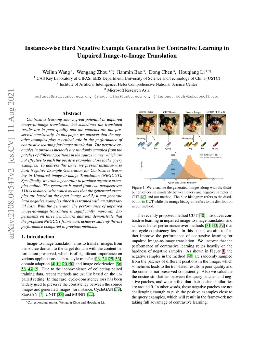 Contrastive learning shows great potential in unpaired image-to-image translation, but sometimes the translated results are in poor quality and the contents are not preserved consistently. In this paper, we uncover that the negative examples play a critical role in the performance of contrastive learning for image translation. The negative examples in previous methods are randomly sampled from the patches of different positions in the source image, which are not effective to push the positive examples close to the query examples. To address this issue, we present instance-wise hard Negative Example Generation for Contrastive learning in Unpaired image-to-image Translation (NEGCUT). Specifically, we train a generator to produce negative examples online. The generator is novel from two perspectives: 1) it is instance-wise which means that the generated examples are based on the input image, and 2) it can generate hard negative examples since it is trained with an adversarial loss. With the generator, the performance of unpaired image-to-image translation is significantly improved. Experiments on three benchmark datasets demonstrate that the proposed NEGCUT framework achieves state-of-the-art performance compared to previous methods.
