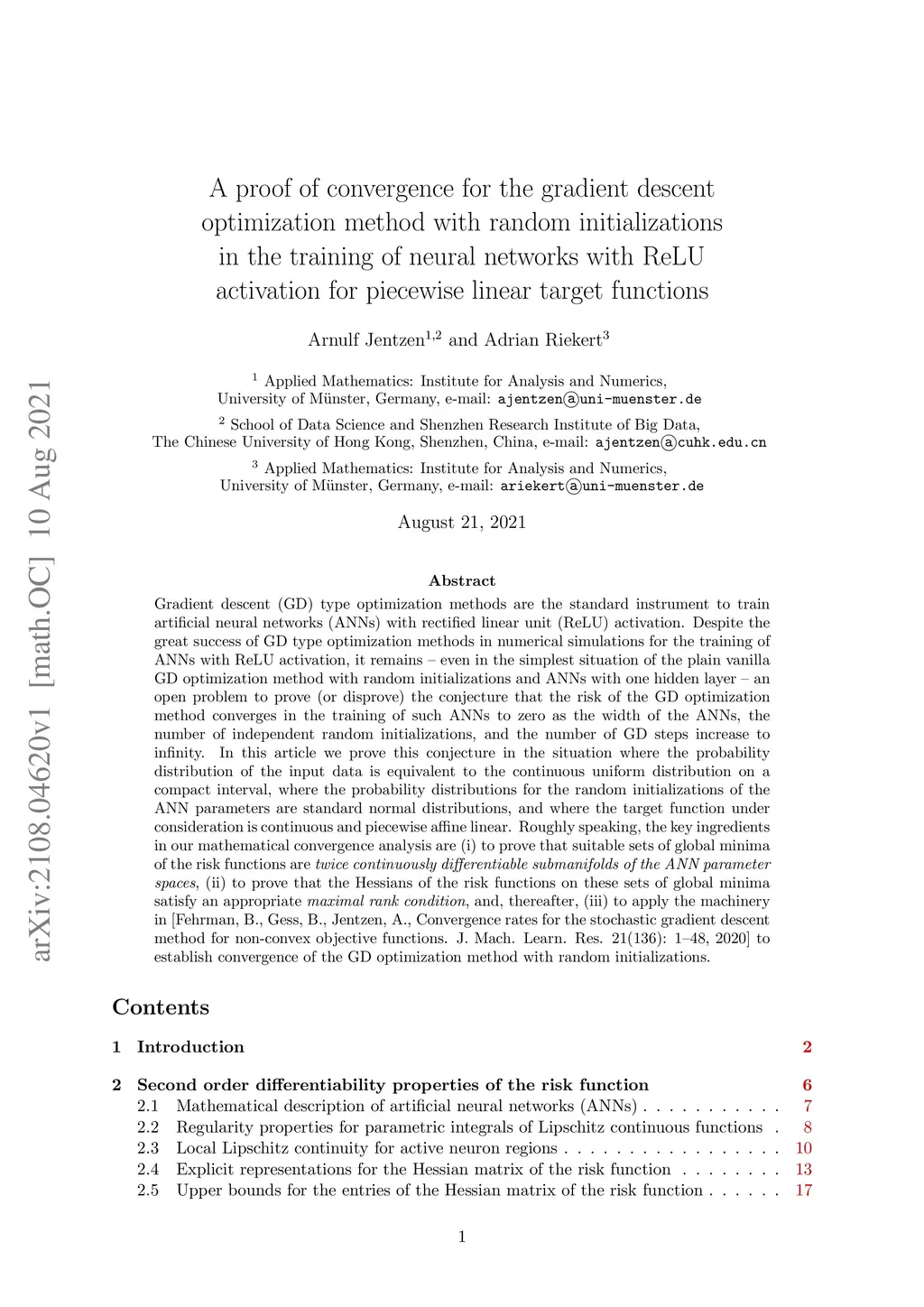 Gradient descent (GD) type optimization methods are the standard instrument to train artificial neural networks (ANNs) with rectified linear unit (ReLU) activation. Despite the great success of GD type optimization methods in numerical simulations for the training of ANNs with ReLU activation, it remains - even in the simplest situation of the plain vanilla GD optimization method with random initializations and ANNs with one hidden layer - an open problem to prove (or disprove) the conjecture that the risk of the GD optimization method converges in the training of such ANNs to zero as the width of the ANNs, the number of independent random initializations, and the number of GD steps increase to infinity. In this article we prove this conjecture in the situation where the probability distribution of the input data is equivalent to the continuous uniform distribution on a compact interval, where the probability distributions for the random initializations of the ANN parameters are standard normal distributions, and where the target function under consideration is continuous and piecewise affine linear. Roughly speaking, the key ingredients in our mathematical convergence analysis are (i) to prove that suitable sets of global minima of the risk functions are \emph{twice continuously differentiable submanifolds of the ANN parameter spaces}, (ii) to prove that the Hessians of the risk functions on these sets of global minima satisfy an appropriate \emph{maximal rank condition}, and, thereafter, (iii) to apply the machinery in [Fehrman, B., Gess, B., Jentzen, A., Convergence rates for the stochastic gradient descent method for non-convex objective functions. J. Mach. Learn. Res. 21(136): 1--48, 2020] to establish convergence of the GD optimization method with random initializations.