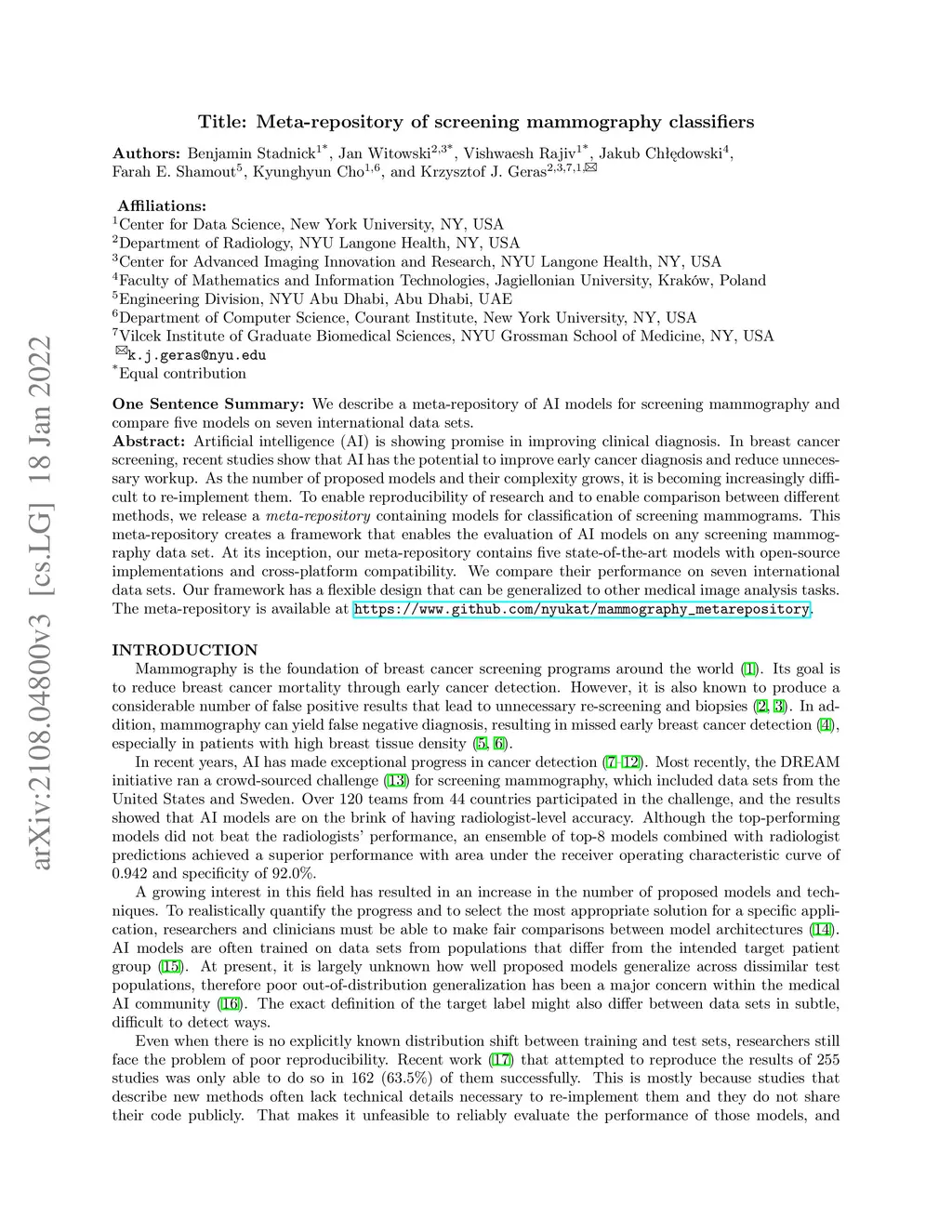 Artificial intelligence (AI) is showing promise in improving clinical diagnosis. In breast cancer screening, recent studies show that AI has the potential to improve early cancer diagnosis and reduce unnecessary workup. As the number of proposed models and their complexity grows, it is becoming increasingly difficult to re-implement them. To enable reproducibility of research and to enable comparison between different methods, we release a meta-repository containing models for classification of screening mammograms. This meta-repository creates a framework that enables the evaluation of AI models on any screening mammography data set. At its inception, our meta-repository contains five state-of-the-art models with open-source implementations and cross-platform compatibility. We compare their performance on seven international data sets. Our framework has a flexible design that can be generalized to other medical image analysis tasks. The meta-repository is available at https://www.github.com/nyukat/mammography_metarepository.