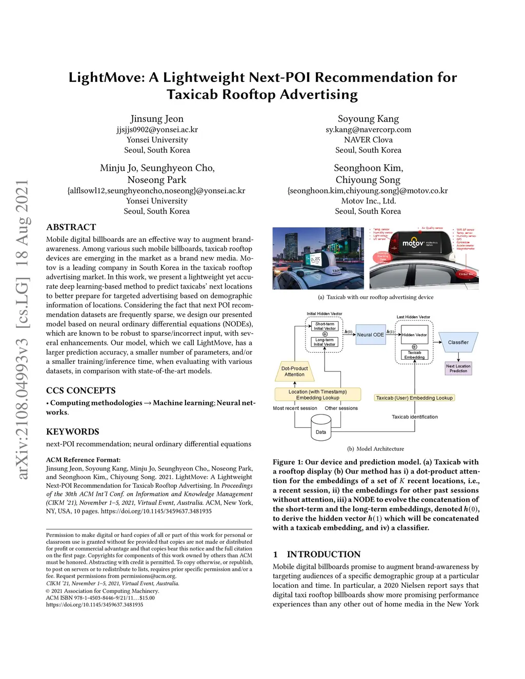 Mobile digital billboards are an effective way to augment brand-awareness. Among various such mobile billboards, taxicab rooftop devices are emerging in the market as a brand new media. Motov is a leading company in South Korea in the taxicab rooftop advertising market. In this work, we present a lightweight yet accurate deep learning-based method to predict taxicabs' next locations to better prepare for targeted advertising based on demographic information of locations. Considering the fact that next POI recommendation datasets are frequently sparse, we design our presented model based on neural ordinary differential equations (NODEs), which are known to be robust to sparse/incorrect input, with several enhancements. Our model, which we call LightMove, has a larger prediction accuracy, a smaller number of parameters, and/or a smaller training/inference time, when evaluating with various datasets, in comparison with state-of-the-art models.