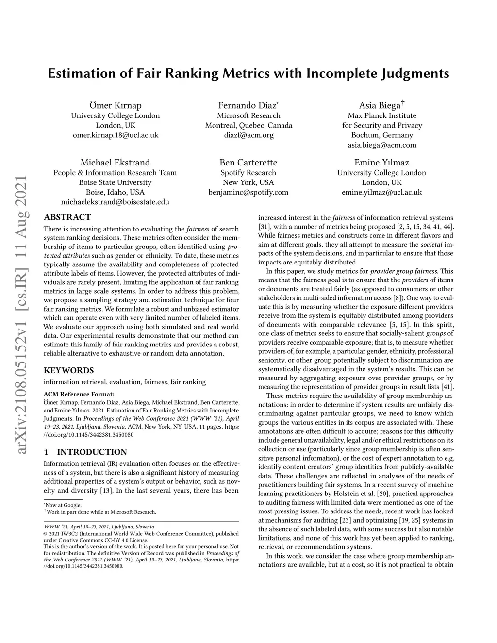Estimation of Fair Ranking Metrics with Incomplete Judgments