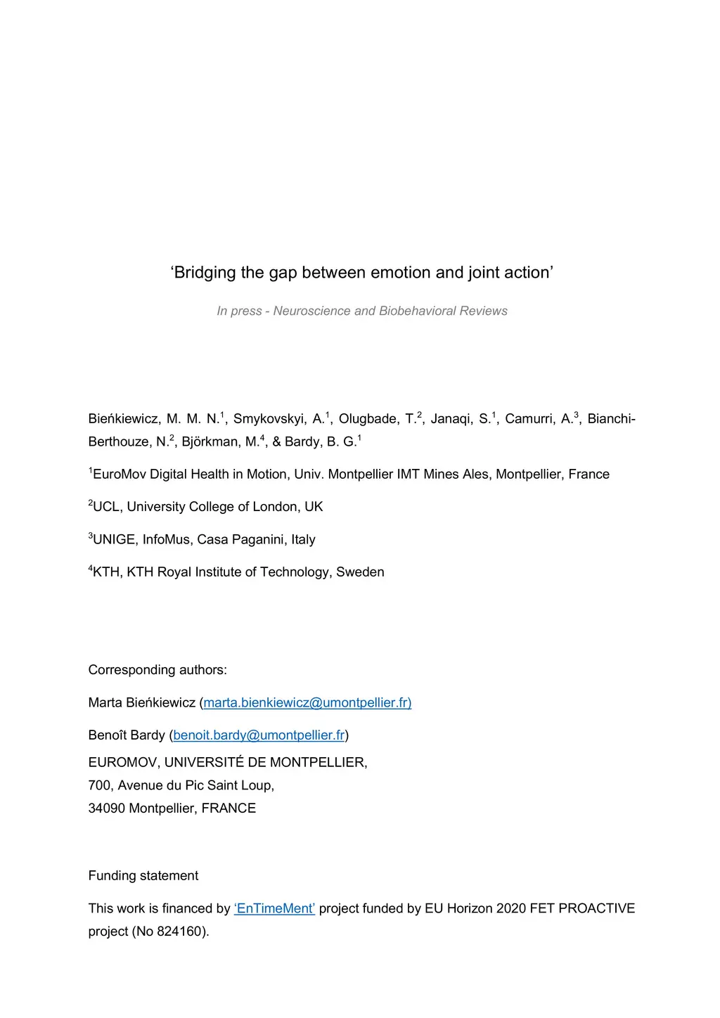 Our daily human life is filled with a myriad of joint action moments, be it children playing, adults working together (i.e., team sports), or strangers navigating through a crowd. Joint action brings individuals (and embodiment of their emotions) together, in space and in time. Yet little is known about how individual emotions propagate through embodied presence in a group, and how joint action changes individual emotion. In fact, the multi-agent component is largely missing from neuroscience-based approaches to emotion, and reversely joint action research has not found a way yet to include emotion as one of the key parameters to model socio-motor interaction. In this review, we first identify the gap and then stockpile evidence showing strong entanglement between emotion and acting together from various branches of sciences. We propose an integrative approach to bridge the gap, highlight five research avenues to do so in behavioral neuroscience and digital sciences, and address some of the key challenges in the area faced by modern societies.