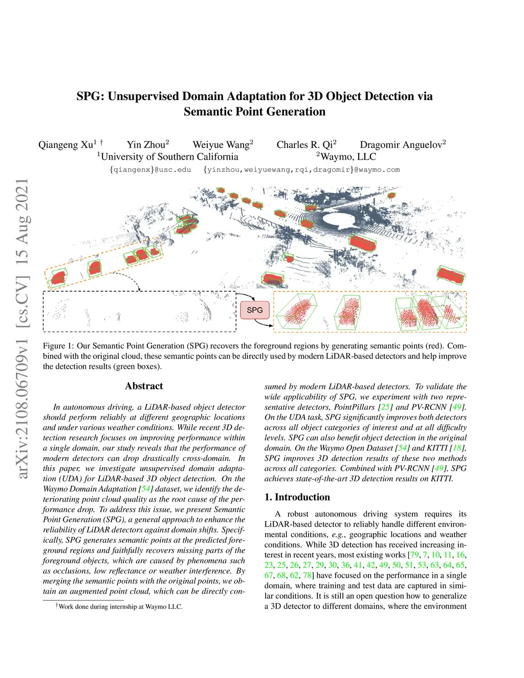 SPG: Unsupervised Domain Adaptation for 3D Object Detection via Semantic