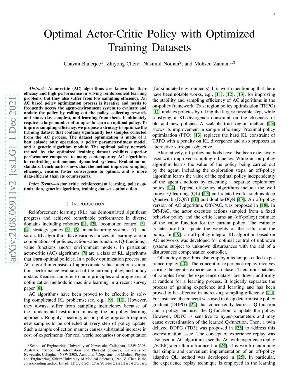 Optimal Actor-Critic Policy with Optimized Training Datasets
