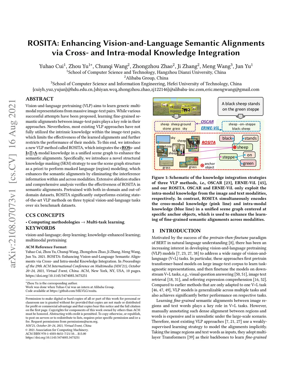Vision-and-language pretraining (VLP) aims to learn generic multimodal representations from massive image-text pairs. While various successful attempts have been proposed, learning fine-grained semantic alignments between image-text pairs plays a key role in their approaches. Nevertheless, most existing VLP approaches have not fully utilized the intrinsic knowledge within the image-text pairs, which limits the effectiveness of the learned alignments and further restricts the performance of their models. To this end, we introduce a new VLP method called ROSITA, which integrates the cross- and intra-modal knowledge in a unified scene graph to enhance the semantic alignments. Specifically, we introduce a novel structural knowledge masking (SKM) strategy to use the scene graph structure as a priori to perform masked language (region) modeling, which enhances the semantic alignments by eliminating the interference information within and across modalities. Extensive ablation studies and comprehensive analysis verifies the effectiveness of ROSITA in semantic alignments. Pretrained with both in-domain and out-of-domain datasets, ROSITA significantly outperforms existing state-of-the-art VLP methods on three typical vision-and-language tasks over six benchmark datasets.