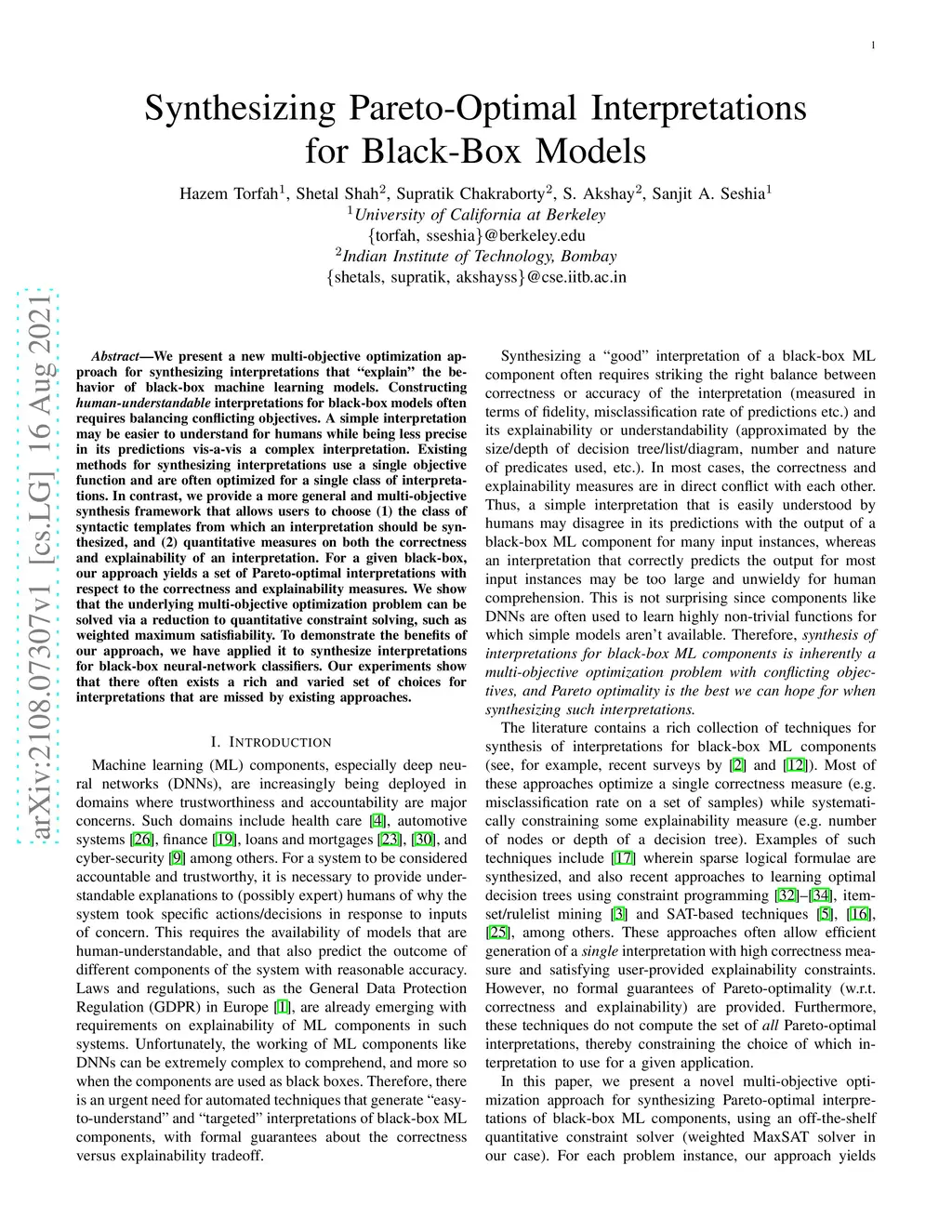 We present a new multi-objective optimization approach for synthesizing interpretations that "explain" the behavior of black-box machine learning models. Constructing human-understandable interpretations for black-box models often requires balancing conflicting objectives. A simple interpretation may be easier to understand for humans while being less precise in its predictions vis-a-vis a complex interpretation. Existing methods for synthesizing interpretations use a single objective function and are often optimized for a single class of interpretations. In contrast, we provide a more general and multi-objective synthesis framework that allows users to choose (1) the class of syntactic templates from which an interpretation should be synthesized, and (2) quantitative measures on both the correctness and explainability of an interpretation. For a given black-box, our approach yields a set of Pareto-optimal interpretations with respect to the correctness and explainability measures. We show that the underlying multi-objective optimization problem can be solved via a reduction to quantitative constraint solving, such as weighted maximum satisfiability. To demonstrate the benefits of our approach, we have applied it to synthesize interpretations for black-box neural-network classifiers. Our experiments show that there often exists a rich and varied set of choices for interpretations that are missed by existing approaches.
