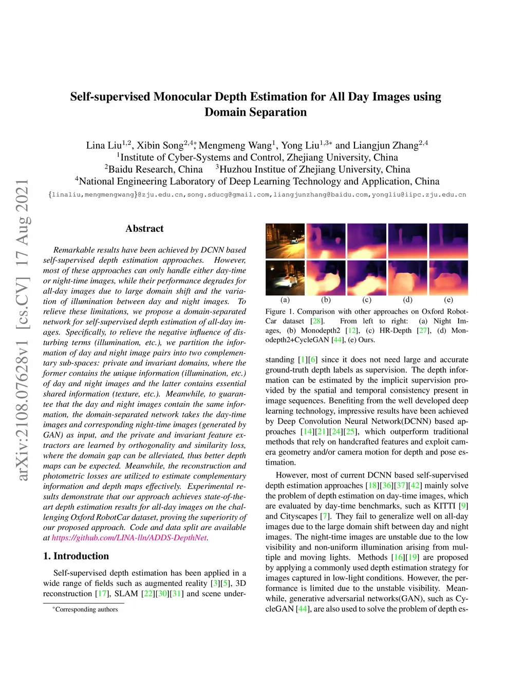 Remarkable results have been achieved by DCNN based self-supervised depth estimation approaches. However, most of these approaches can only handle either day-time or night-time images, while their performance degrades for all-day images due to large domain shift and the variation of illumination between day and night images. To relieve these limitations, we propose a domain-separated network for self-supervised depth estimation of all-day images. Specifically, to relieve the negative influence of disturbing terms (illumination, etc.), we partition the information of day and night image pairs into two complementary sub-spaces: private and invariant domains, where the former contains the unique information (illumination, etc.) of day and night images and the latter contains essential shared information (texture, etc.). Meanwhile, to guarantee that the day and night images contain the same information, the domain-separated network takes the day-time images and corresponding night-time images (generated by GAN) as input, and the private and invariant feature extractors are learned by orthogonality and similarity loss, where the domain gap can be alleviated, thus better depth maps can be expected. Meanwhile, the reconstruction and photometric losses are utilized to estimate complementary information and depth maps effectively. Experimental results demonstrate that our approach achieves state-of-the-art depth estimation results for all-day images on the challenging Oxford RobotCar dataset, proving the superiority of our proposed approach.