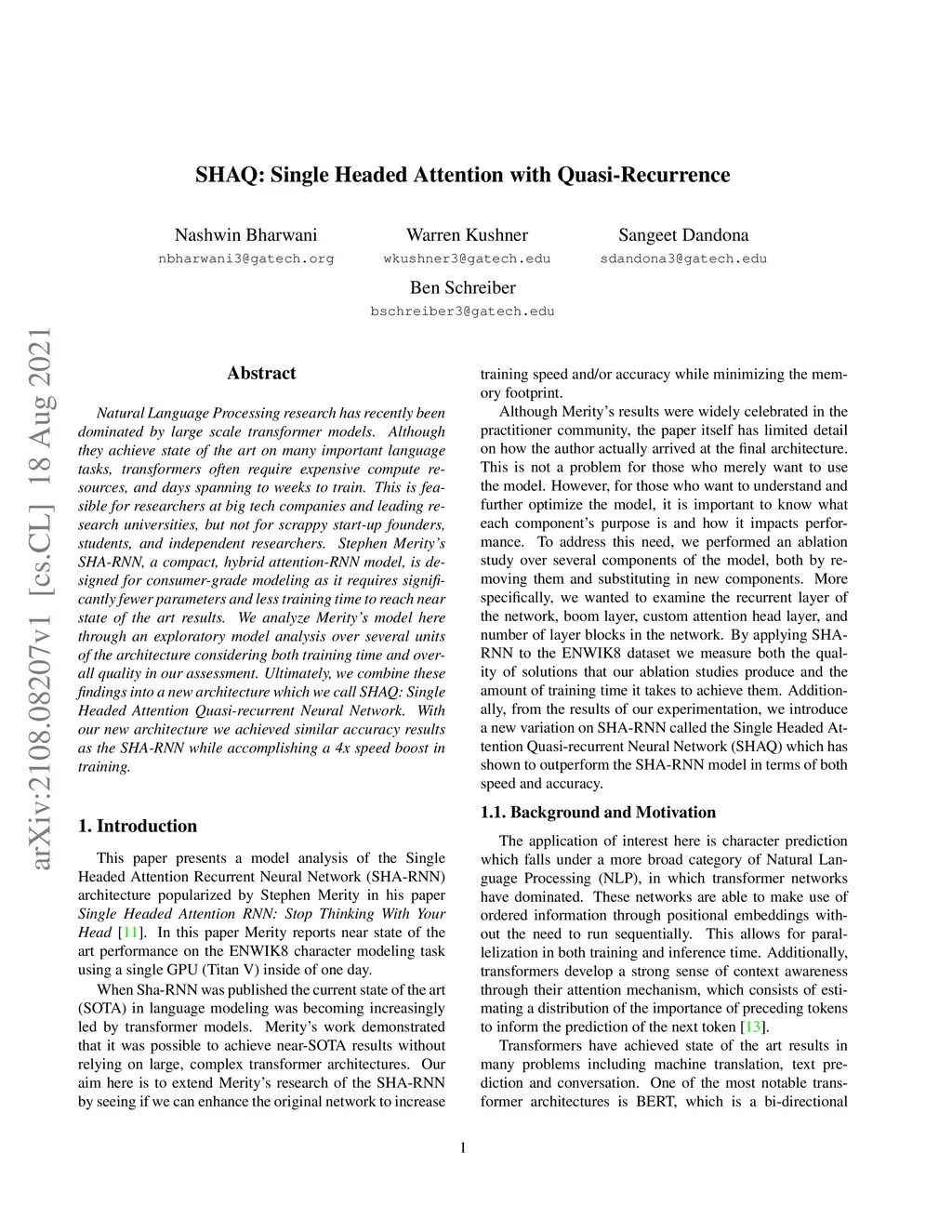 Natural Language Processing research has recently been dominated by large scale transformer models. Although they achieve state of the art on many important language tasks, transformers often require expensive compute resources, and days spanning to weeks to train. This is feasible for researchers at big tech companies and leading research universities, but not for scrappy start-up founders, students, and independent researchers. Stephen Merity's SHA-RNN, a compact, hybrid attention-RNN model, is designed for consumer-grade modeling as it requires significantly fewer parameters and less training time to reach near state of the art results. We analyze Merity's model here through an exploratory model analysis over several units of the architecture considering both training time and overall quality in our assessment. Ultimately, we combine these findings into a new architecture which we call SHAQ: Single Headed Attention Quasi-recurrent Neural Network. With our new architecture we achieved similar accuracy results as the SHA-RNN while accomplishing a 4x speed boost in training.