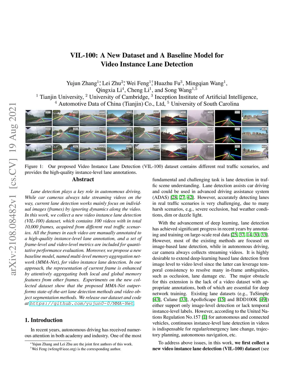 Lane detection plays a key role in autonomous driving. While car cameras always take streaming videos on the way, current lane detection works mainly focus on individual images (frames) by ignoring dynamics along the video. In this work, we collect a new video instance lane detection (VIL-100) dataset, which contains 100 videos with in total 10,000 frames, acquired from different real traffic scenarios. All the frames in each video are manually annotated to a high-quality instance-level lane annotation, and a set of frame-level and video-level metrics are included for quantitative performance evaluation. Moreover, we propose a new baseline model, named multi-level memory aggregation network (MMA-Net), for video instance lane detection. In our approach, the representation of current frame is enhanced by attentively aggregating both local and global memory features from other frames. Experiments on the new collected dataset show that the proposed MMA-Net outperforms state-of-the-art lane detection methods and video object segmentation methods. We release our dataset and code at https://github.com/yujun0-0/MMA-Net.