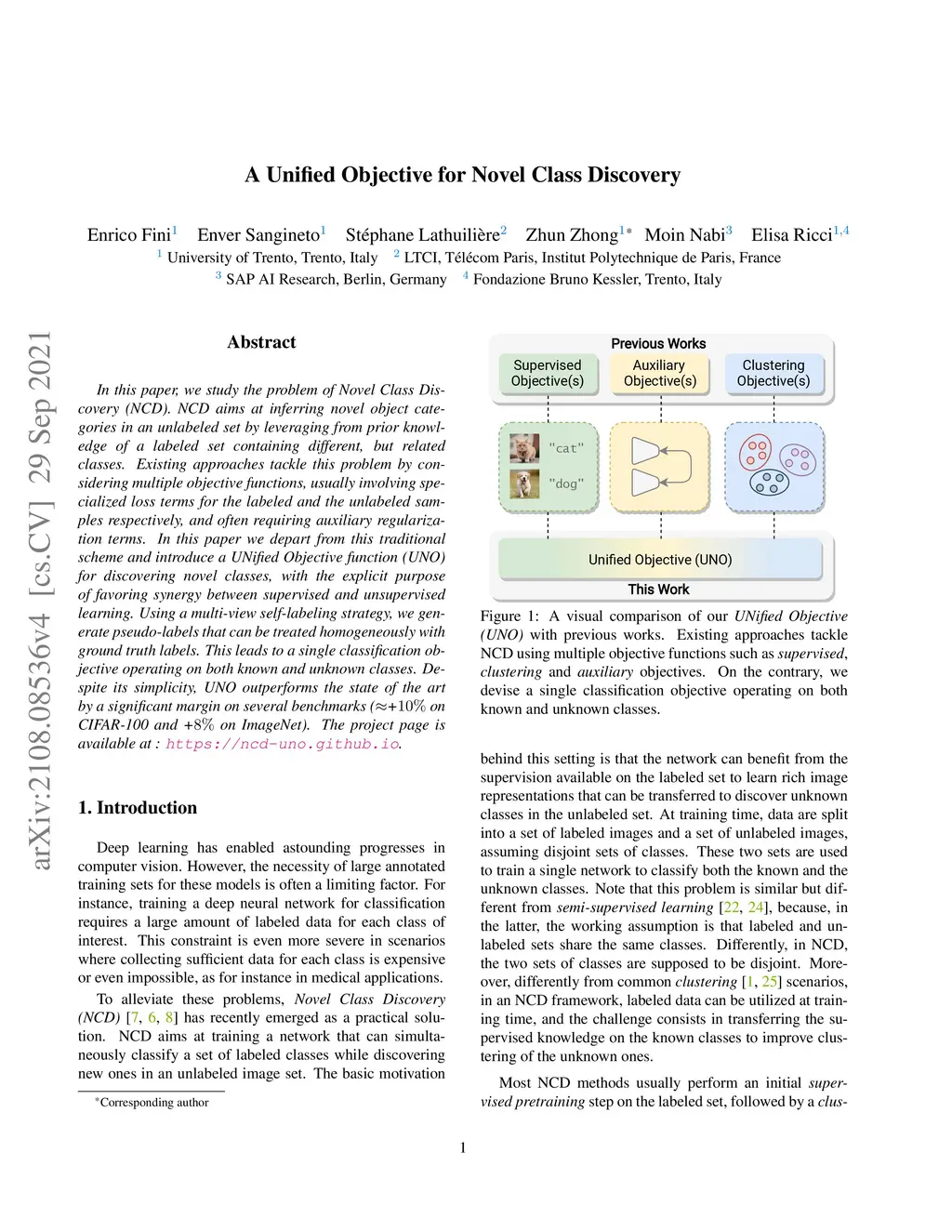 In this paper, we study the problem of Novel Class Discovery (NCD). NCD aims at inferring novel object categories in an unlabeled set by leveraging from prior knowledge of a labeled set containing different, but related classes. Existing approaches tackle this problem by considering multiple objective functions, usually involving specialized loss terms for the labeled and the unlabeled samples respectively, and often requiring auxiliary regularization terms. In this paper, we depart from this traditional scheme and introduce a UNified Objective function (UNO) for discovering novel classes, with the explicit purpose of favoring synergy between supervised and unsupervised learning. Using a multi-view self-labeling strategy, we generate pseudo-labels that can be treated homogeneously with ground truth labels. This leads to a single classification objective operating on both known and unknown classes. Despite its simplicity, UNO outperforms the state of the art by a significant margin on several benchmarks (~+10% on CIFAR-100 and +8% on ImageNet). The project page is available at: https://ncd-uno.github.io.