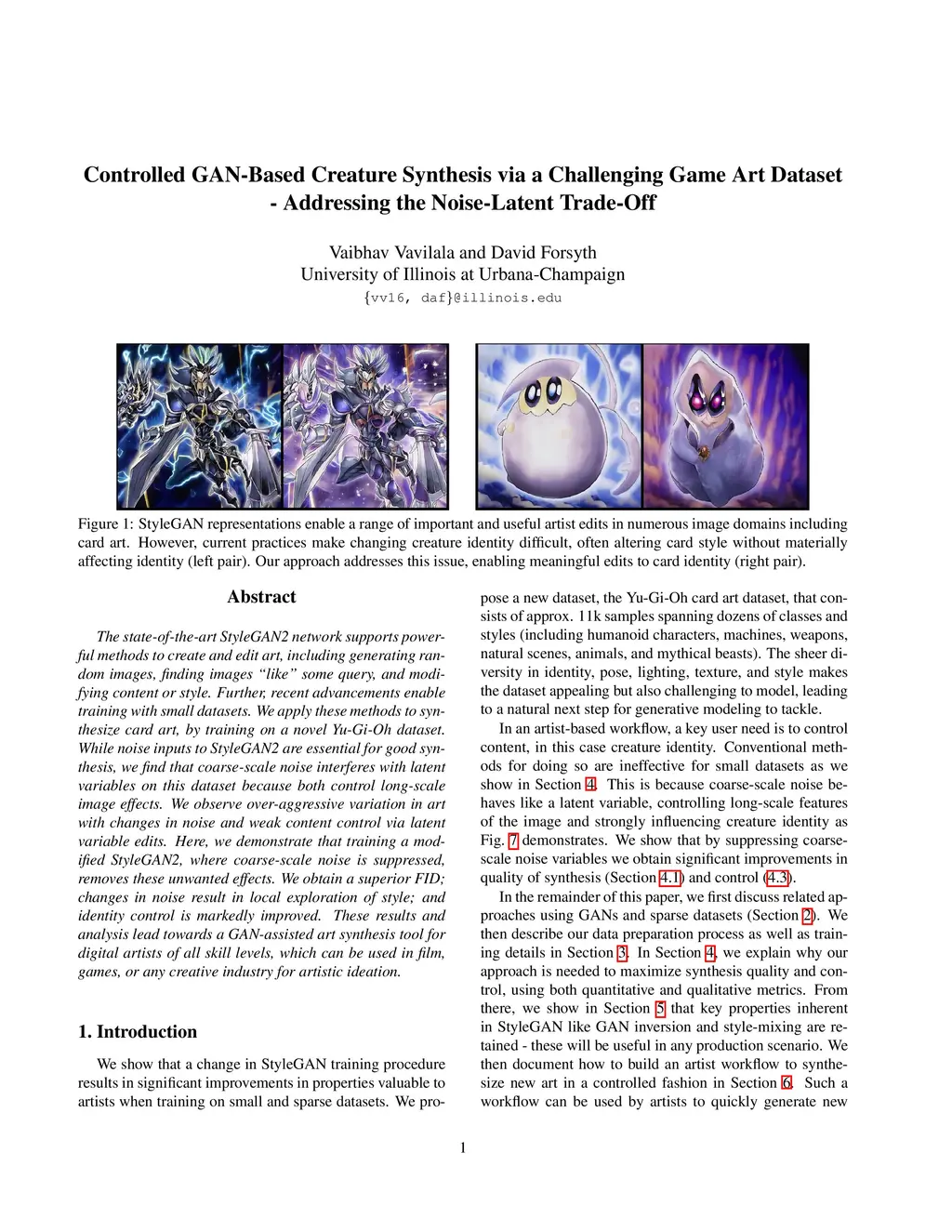 The state-of-the-art StyleGAN2 network supports powerful methods to create and edit art, including generating random images, finding images "like" some query, and modifying content or style. Further, recent advancements enable training with small datasets. We apply these methods to synthesize card art, by training on a novel Yu-Gi-Oh dataset. While noise inputs to StyleGAN2 are essential for good synthesis, we find that coarse-scale noise interferes with latent variables on this dataset because both control long-scale image effects. We observe over-aggressive variation in art with changes in noise and weak content control via latent variable edits. Here, we demonstrate that training a modified StyleGAN2, where coarse-scale noise is suppressed, removes these unwanted effects. We obtain a superior FID; changes in noise result in local exploration of style; and identity control is markedly improved. These results and analysis lead towards a GAN-assisted art synthesis tool for digital artists of all skill levels, which can be used in film, games, or any creative industry for artistic ideation.
