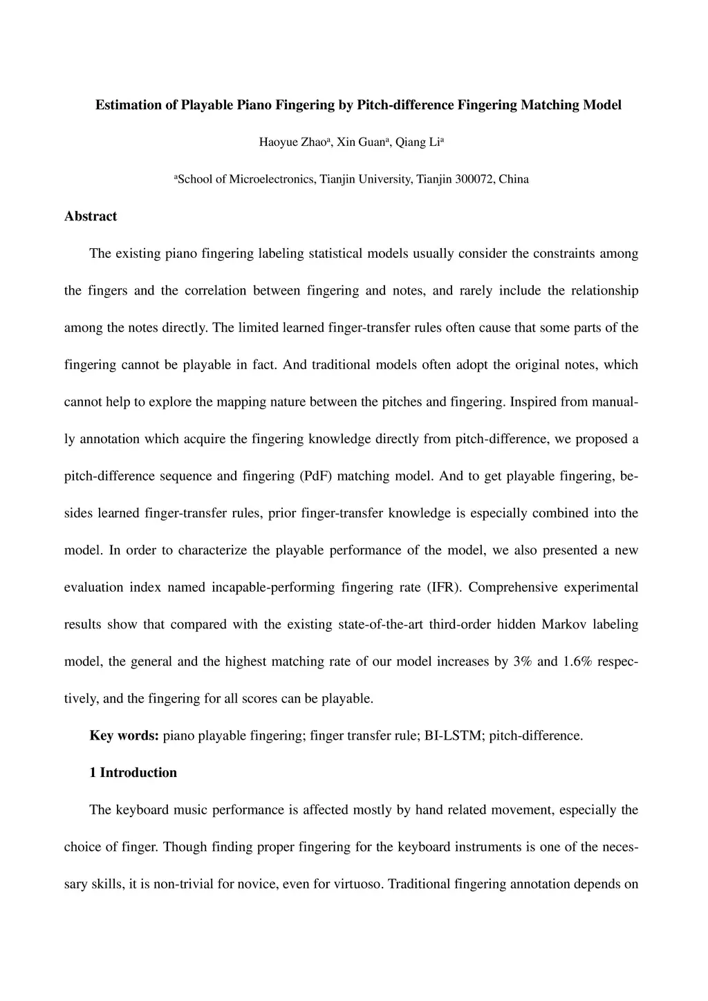 The existing piano fingering labeling statistical models usually consider the constraints among the fingers and the correlation between fingering and notes, and rarely include the relationship among the notes directly. The limited learned finger-transfer rules often cause that some parts of the fingering cannot be playable in fact. And traditional models often adopt the original notes, which cannot help to explore the mapping nature between the pitches and fingering. Inspired from manual-ly annotation which acquire the fingering knowledge directly from pitch-difference, we proposed a pitch-difference sequence and fingering (PdF) matching model. And to get playable fingering, be-sides learned finger-transfer rules, prior finger-transfer knowledge is especially combined into the model. In order to characterize the playable performance of the model, we also presented a new evaluation index named incapable-performing fingering rate (IFR). Comprehensive experimental re-sults show that compared with the existing state-of-the-art third-order hidden Markov labeling model, the general and the highest matching rate of our model increases by 3% and 1.6% respective-ly, and the fingering for all scores can be playable.