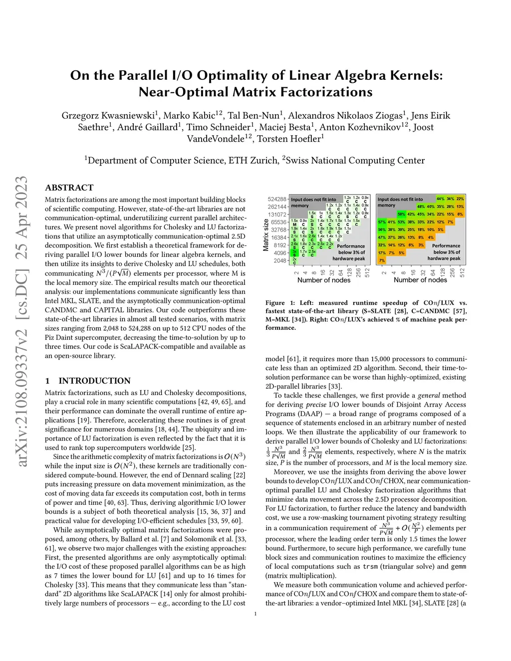 Matrix factorizations are among the most important building blocks of scientific computing. State-of-the-art libraries, however, are not communication-optimal, underutilizing current parallel architectures. We present novel algorithms for Cholesky and LU factorizations that utilize an asymptotically communication-optimal 2.5D decomposition. We first establish a theoretical framework for deriving parallel I/O lower bounds for linear algebra kernels, and then utilize its insights to derive Cholesky and LU schedules, both communicating N^3/(P*sqrt(M)) elements per processor, where M is the local memory size. The empirical results match our theoretical analysis: our implementations communicate significantly less than Intel MKL, SLATE, and the asymptotically communication-optimal CANDMC and CAPITAL libraries. Our code outperforms these state-of-the-art libraries in almost all tested scenarios, with matrix sizes ranging from 2,048 to 262,144 on up to 512 CPU nodes of the Piz Daint supercomputer, decreasing the time-to-solution by up to three times. Our code is ScaLAPACK-compatible and available as an open-source library.