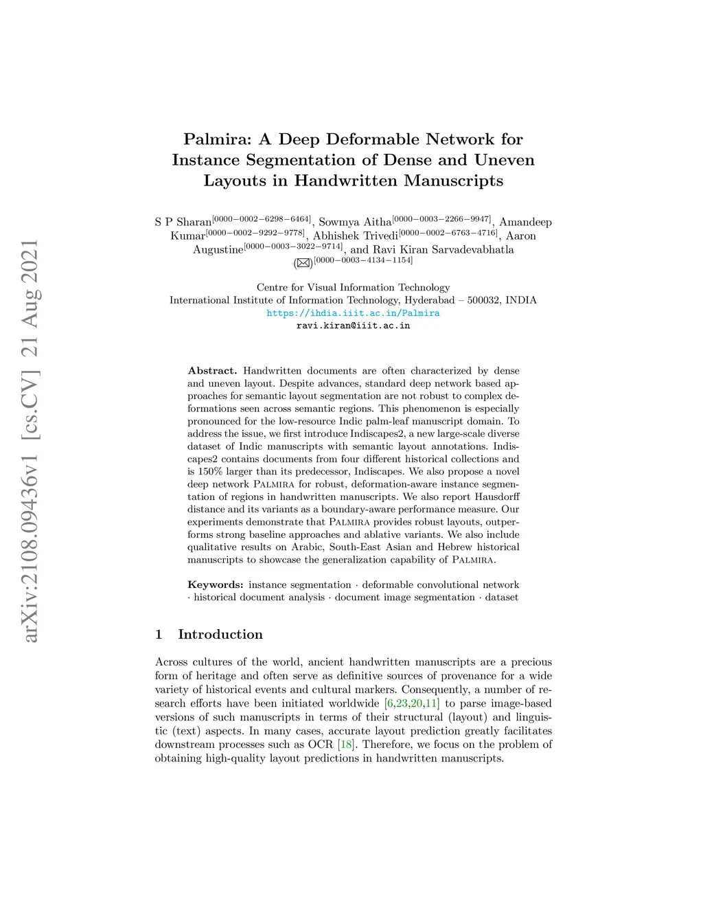 Handwritten documents are often characterized by dense and uneven layout. Despite advances, standard deep network based approaches for semantic layout segmentation are not robust to complex deformations seen across semantic regions. This phenomenon is especially pronounced for the low-resource Indic palm-leaf manuscript domain. To address the issue, we first introduce Indiscapes2, a new large-scale diverse dataset of Indic manuscripts with semantic layout annotations. Indiscapes2 contains documents from four different historical collections and is 150% larger than its predecessor, Indiscapes. We also propose a novel deep network Palmira for robust, deformation-aware instance segmentation of regions in handwritten manuscripts. We also report Hausdorff distance and its variants as a boundary-aware performance measure. Our experiments demonstrate that Palmira provides robust layouts, outperforms strong baseline approaches and ablative variants. We also include qualitative results on Arabic, South-East Asian and Hebrew historical manuscripts to showcase the generalization capability of Palmira.