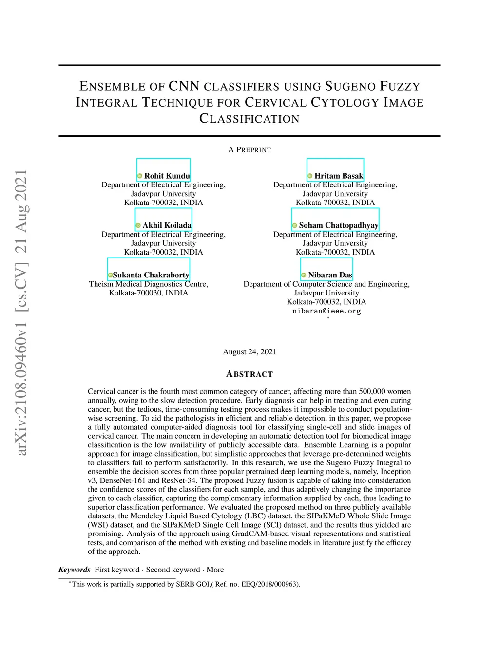Cervical cancer is the fourth most common category of cancer, affecting more than 500,000 women annually, owing to the slow detection procedure. Early diagnosis can help in treating and even curing cancer, but the tedious, time-consuming testing process makes it impossible to conduct population-wise screening. To aid the pathologists in efficient and reliable detection, in this paper, we propose a fully automated computer-aided diagnosis tool for classifying single-cell and slide images of cervical cancer. The main concern in developing an automatic detection tool for biomedical image classification is the low availability of publicly accessible data. Ensemble Learning is a popular approach for image classification, but simplistic approaches that leverage pre-determined weights to classifiers fail to perform satisfactorily. In this research, we use the Sugeno Fuzzy Integral to ensemble the decision scores from three popular pretrained deep learning models, namely, Inception v3, DenseNet-161 and ResNet-34. The proposed Fuzzy fusion is capable of taking into consideration the confidence scores of the classifiers for each sample, and thus adaptively changing the importance given to each classifier, capturing the complementary information supplied by each, thus leading to superior classification performance. We evaluated the proposed method on three publicly available datasets, the Mendeley Liquid Based Cytology (LBC) dataset, the SIPaKMeD Whole Slide Image (WSI) dataset, and the SIPaKMeD Single Cell Image (SCI) dataset, and the results thus yielded are promising. Analysis of the approach using GradCAM-based visual representations and statistical tests, and comparison of the method with existing and baseline models in literature justify the efficacy of the approach.