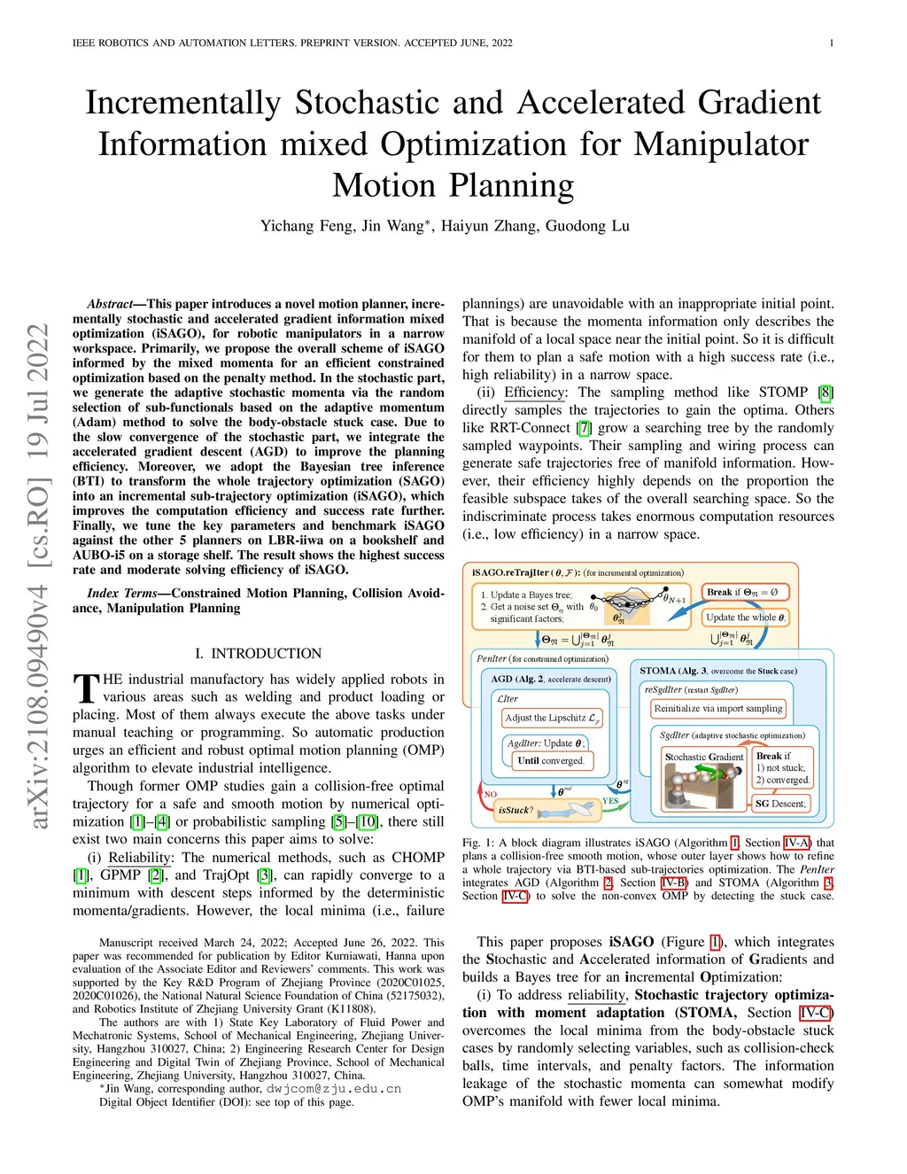 This paper introduces a novel motion planner, incrementally stochastic and accelerated gradient information mixed optimization (iSAGO), for robotic manipulators in a narrow workspace. Primarily, we propose the overall scheme of iSAGO informed by the mixed momenta for an efficient constrained optimization based on the penalty method. In the stochastic part, we generate the adaptive stochastic momenta via the random selection of sub-functionals based on the adaptive momentum (Adam) method to solve the body-obstacle stuck case. Due to the slow convergence of the stochastic part, we integrate the accelerated gradient descent (AGD) to improve the planning efficiency. Moreover, we adopt the Bayesian tree inference (BTI) to transform the whole trajectory optimization (SAGO) into an incremental sub-trajectory optimization (iSAGO), which improves the computation efficiency and success rate further. Finally, we tune the key parameters and benchmark iSAGO against the other 5 planners on LBR-iiwa in a bookshelf and AUBO-i5 on a storage shelf. The result shows the highest success rate and moderate solving efficiency of iSAGO.