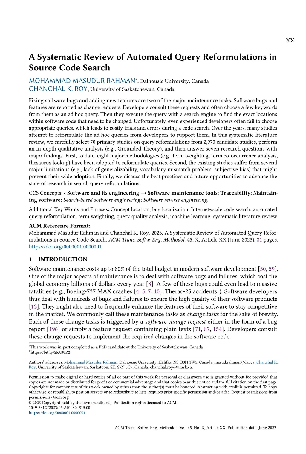 Fixing software bugs and adding new features are two of the major maintenance tasks. Software bugs and features are reported as change requests. Developers consult these requests and often choose a few keywords from them as an ad hoc query. Then they execute the query with a search engine to find the exact locations within software code that need to be changed. Unfortunately, even experienced developers often fail to choose appropriate queries, which leads to costly trials and errors during a code search. Over the years, many studies attempt to reformulate the ad hoc queries from developers to support them. In this systematic literature review, we carefully select 70 primary studies on query reformulations from 2,970 candidate studies, perform an in-depth qualitative analysis (e.g., Grounded Theory), and then answer seven research questions with major findings. First, to date, eight major methodologies (e.g., term weighting, term co-occurrence analysis, thesaurus lookup) have been adopted to reformulate queries. Second, the existing studies suffer from several major limitations (e.g., lack of generalizability, vocabulary mismatch problem, subjective bias) that might prevent their wide adoption. Finally, we discuss the best practices and future opportunities to advance the state of research in search query reformulations.