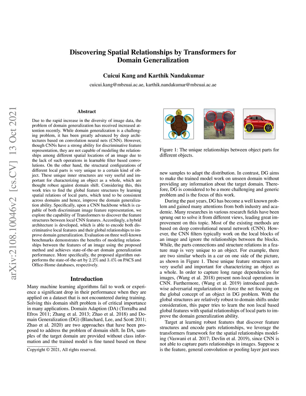 Due to the rapid increase in the diversity of image data, the problem of domain generalization has received increased attention recently. While domain generalization is a challenging problem, it has achieved great development thanks to the fast development of AI techniques in computer vision. Most of these advanced algorithms are proposed with deep architectures based on convolution neural nets (CNN). However, though CNNs have a strong ability to find the discriminative features, they do a poor job of modeling the relations between different locations in the image due to the response to CNN filters are mostly local. Since these local and global spatial relationships are characterized to distinguish an object under consideration, they play a critical role in improving the generalization ability against the domain gap. In order to get the object parts relationships to gain better domain generalization, this work proposes to use the self attention model. However, the attention models are proposed for sequence, which are not expert in discriminate feature extraction for 2D images. Considering this, we proposed a hybrid architecture to discover the spatial relationships between these local features, and derive a composite representation that encodes both the discriminative features and their relationships to improve the domain generalization. Evaluation on three well-known benchmarks demonstrates the benefits of modeling relationships between the features of an image using the proposed method and achieves state-of-the-art domain generalization performance. More specifically, the proposed algorithm outperforms the state-of-the-art by 2.2% and 3.4% on PACS and Office-Home databases, respectively.