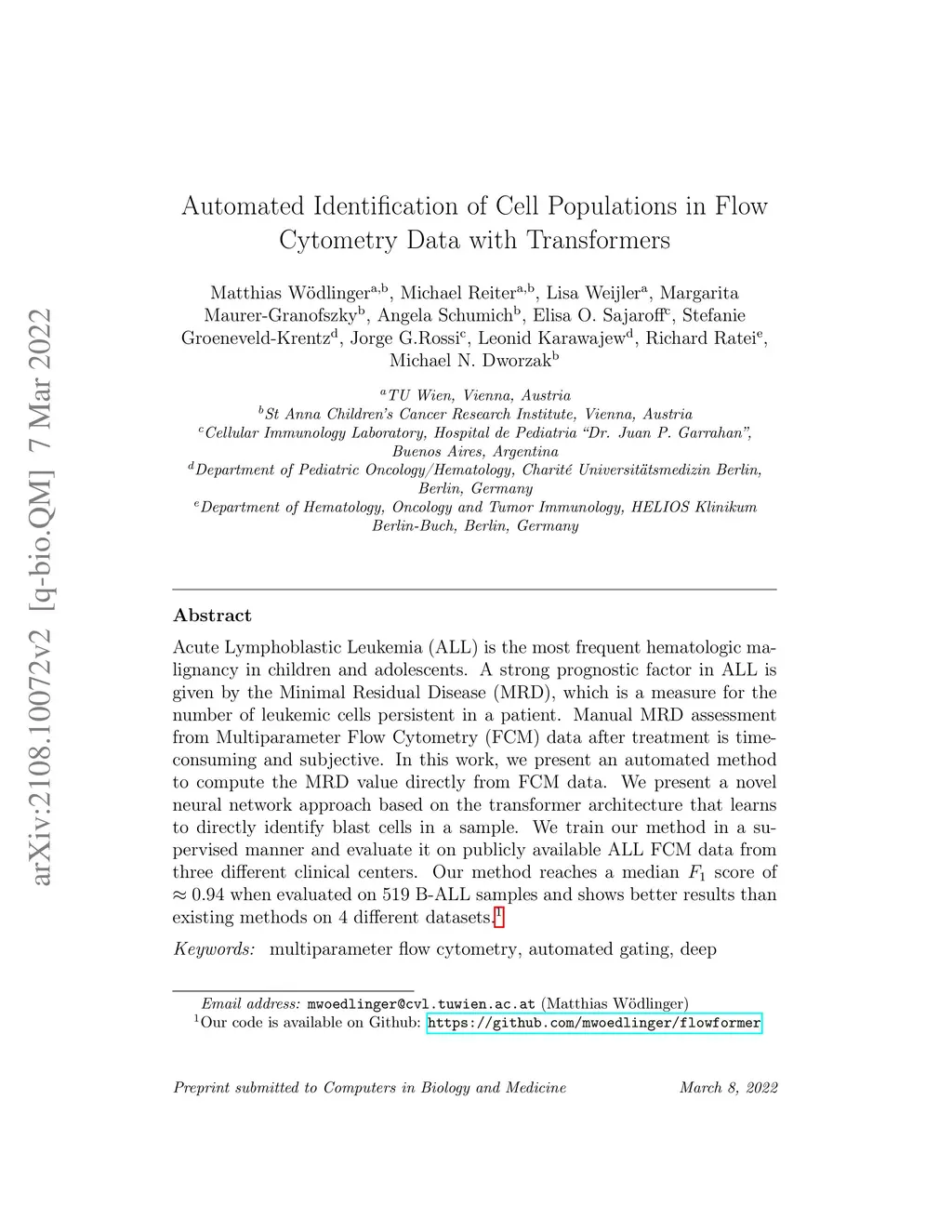 Acute Lymphoblastic Leukemia (ALL) is the most frequent hematologic malignancy in children and adolescents. A strong prognostic factor in ALL is given by the Minimal Residual Disease (MRD), which is a measure for the number of leukemic cells persistent in a patient. Manual MRD assessment from Multiparameter Flow Cytometry (FCM) data after treatment is time-consuming and subjective. In this work, we present an automated method to compute the MRD value directly from FCM data. We present a novel neural network approach based on the transformer architecture that learns to directly identify blast cells in a sample. We train our method in a supervised manner and evaluate it on publicly available ALL FCM data from three different clinical centers. Our method reaches a median F1 score of ~0.94 when evaluated on 519 B-ALL samples and shows better results than existing methods on 4 different datasets