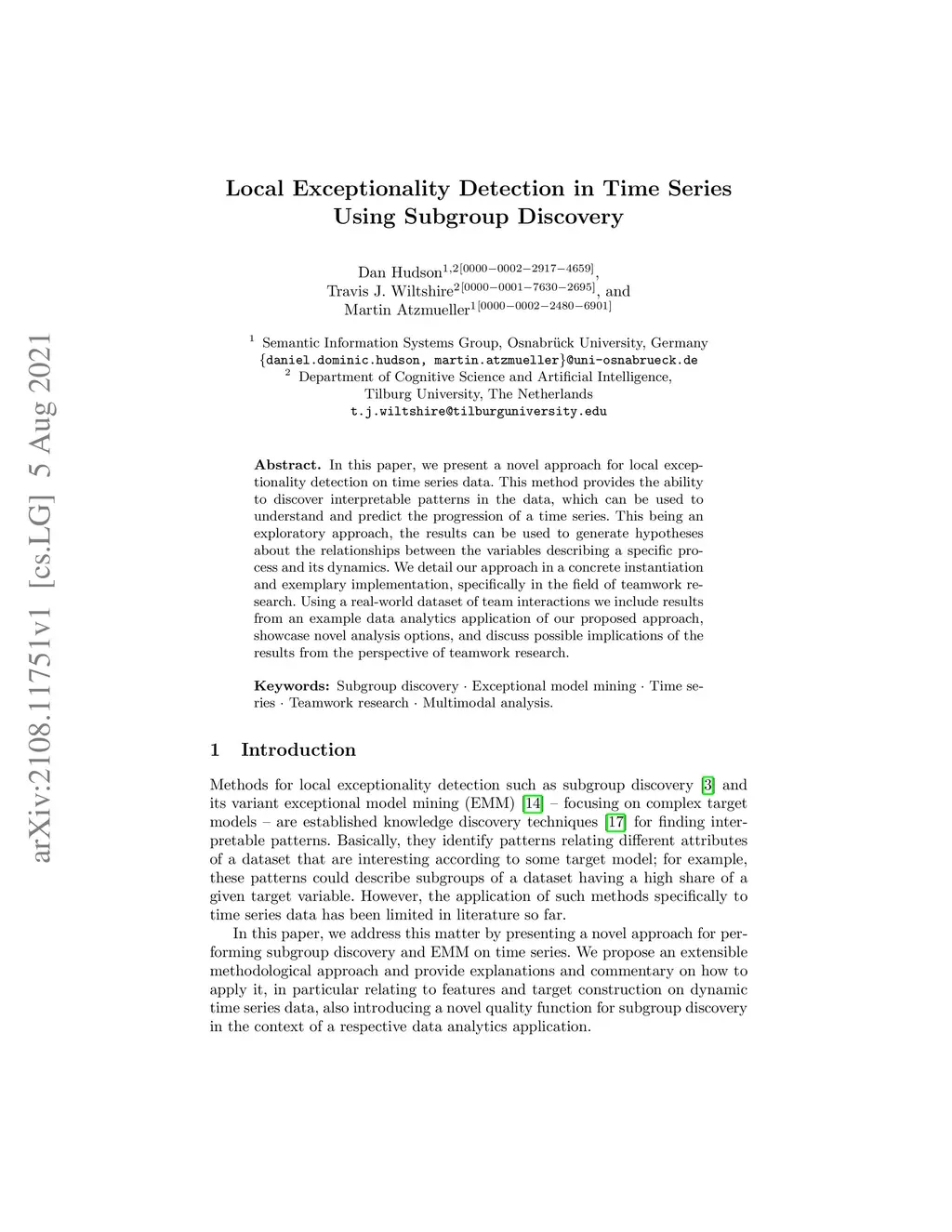 In this paper, we present a novel approach for local exceptionality detection on time series data. This method provides the ability to discover interpretable patterns in the data, which can be used to understand and predict the progression of a time series. This being an exploratory approach, the results can be used to generate hypotheses about the relationships between the variables describing a specific process and its dynamics. We detail our approach in a concrete instantiation and exemplary implementation, specifically in the field of teamwork research. Using a real-world dataset of team interactions we include results from an example data analytics application of our proposed approach, showcase novel analysis options, and discuss possible implications of the results from the perspective of teamwork research.