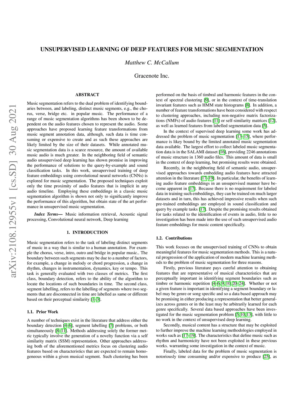 Music segmentation refers to the dual problem of identifying boundaries between, and labeling, distinct music segments, e.g., the chorus, verse, bridge etc. in popular music. The performance of a range of music segmentation algorithms has been shown to be dependent on the audio features chosen to represent the audio. Some approaches have proposed learning feature transformations from music segment annotation data, although, such data is time consuming or expensive to create and as such these approaches are likely limited by the size of their datasets. While annotated music segmentation data is a scarce resource, the amount of available music audio is much greater. In the neighboring field of semantic audio unsupervised deep learning has shown promise in improving the performance of solutions to the query-by-example and sound classification tasks. In this work, unsupervised training of deep feature embeddings using convolutional neural networks (CNNs) is explored for music segmentation. The proposed techniques exploit only the time proximity of audio features that is implicit in any audio timeline. Employing these embeddings in a classic music segmentation algorithm is shown not only to significantly improve the performance of this algorithm, but obtain state of the art performance in unsupervised music segmentation.