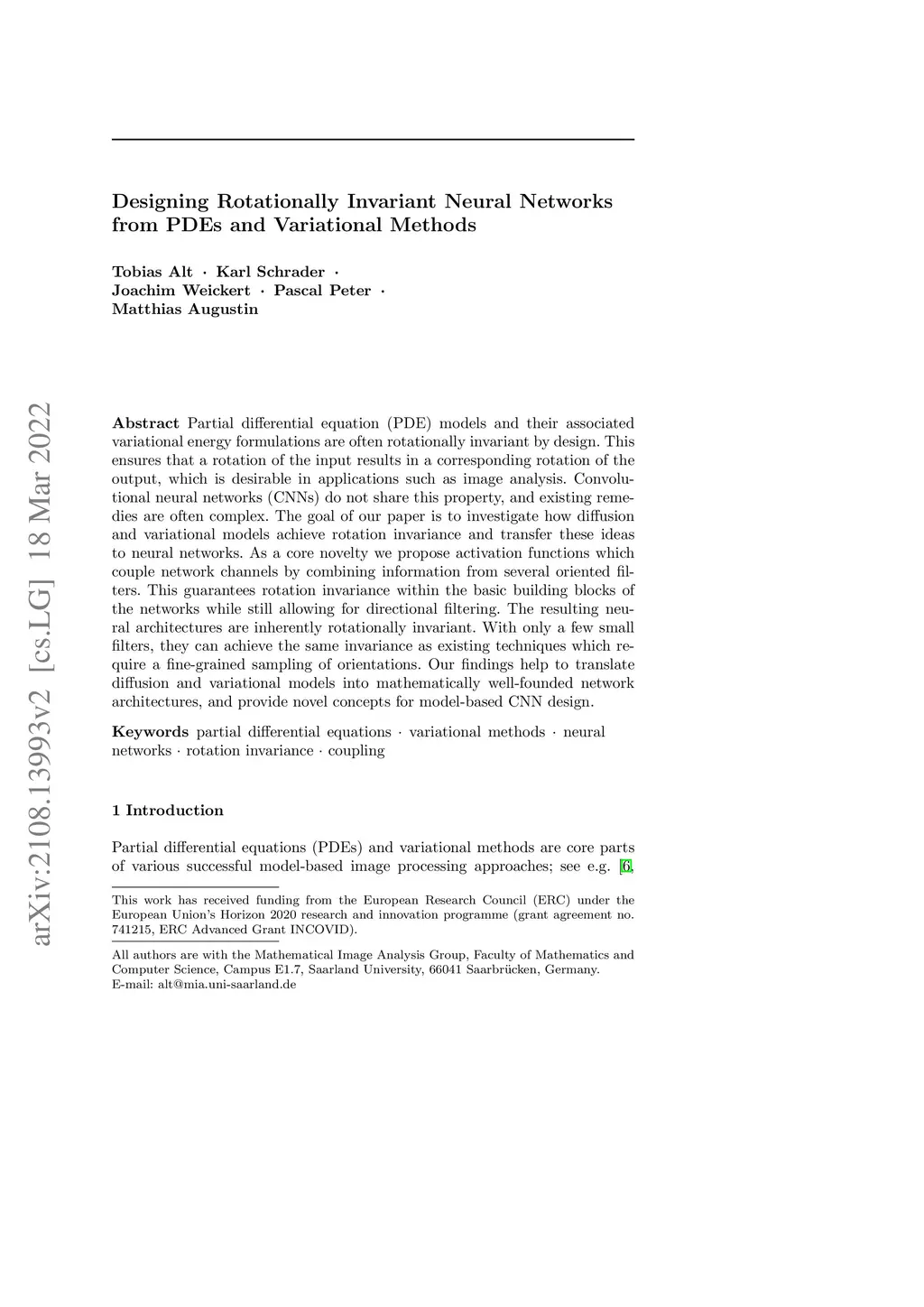 Partial differential equation (PDE) models and their associated variational energy formulations are often rotationally invariant by design. This ensures that a rotation of the input results in a corresponding rotation of the output, which is desirable in applications such as image analysis. Convolutional neural networks (CNNs) do not share this property, and existing remedies are often complex. The goal of our paper is to investigate how diffusion and variational models achieve rotation invariance and transfer these ideas to neural networks. As a core novelty we propose activation functions which couple network channels by combining information from several oriented filters. This guarantees rotation invariance within the basic building blocks of the networks while still allowing for directional filtering. The resulting neural architectures are inherently rotationally invariant. With only a few small filters, they can achieve the same invariance as existing techniques which require a fine-grained sampling of orientations. Our findings help to translate diffusion and variational models into mathematically well-founded network architectures, and provide novel concepts for model-based CNN design.