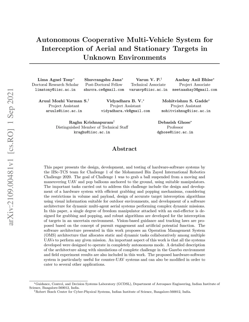 This paper presents the design, development, and testing of hardware-software systems by the IISc-TCS team for Challenge 1 of the Mohammed Bin Zayed International Robotics Challenge 2020. The goal of Challenge 1 was to grab a ball suspended from a moving and maneuvering UAV and pop balloons anchored to the ground, using suitable manipulators. The important tasks carried out to address this challenge include the design and development of a hardware system with efficient grabbing and popping mechanisms, considering the restrictions in volume and payload, design of accurate target interception algorithms using visual information suitable for outdoor environments, and development of a software architecture for dynamic multi-agent aerial systems performing complex dynamic missions. In this paper, a single degree of freedom manipulator attached with an end-effector is designed for grabbing and popping, and robust algorithms are developed for the interception of targets in an uncertain environment. Vision-based guidance and tracking laws are proposed based on the concept of pursuit engagement and artificial potential function. The software architecture presented in this work proposes an Operation Management System (OMS) architecture that allocates static and dynamic tasks collaboratively among multiple UAVs to perform any given mission. An important aspect of this work is that all the systems developed were designed to operate in completely autonomous mode. A detailed description of the architecture along with simulations of complete challenge in the Gazebo environment and field experiment results are also included in this work. The proposed hardware-software system is particularly useful for counter-UAV systems and can also be modified in order to cater to several other applications.