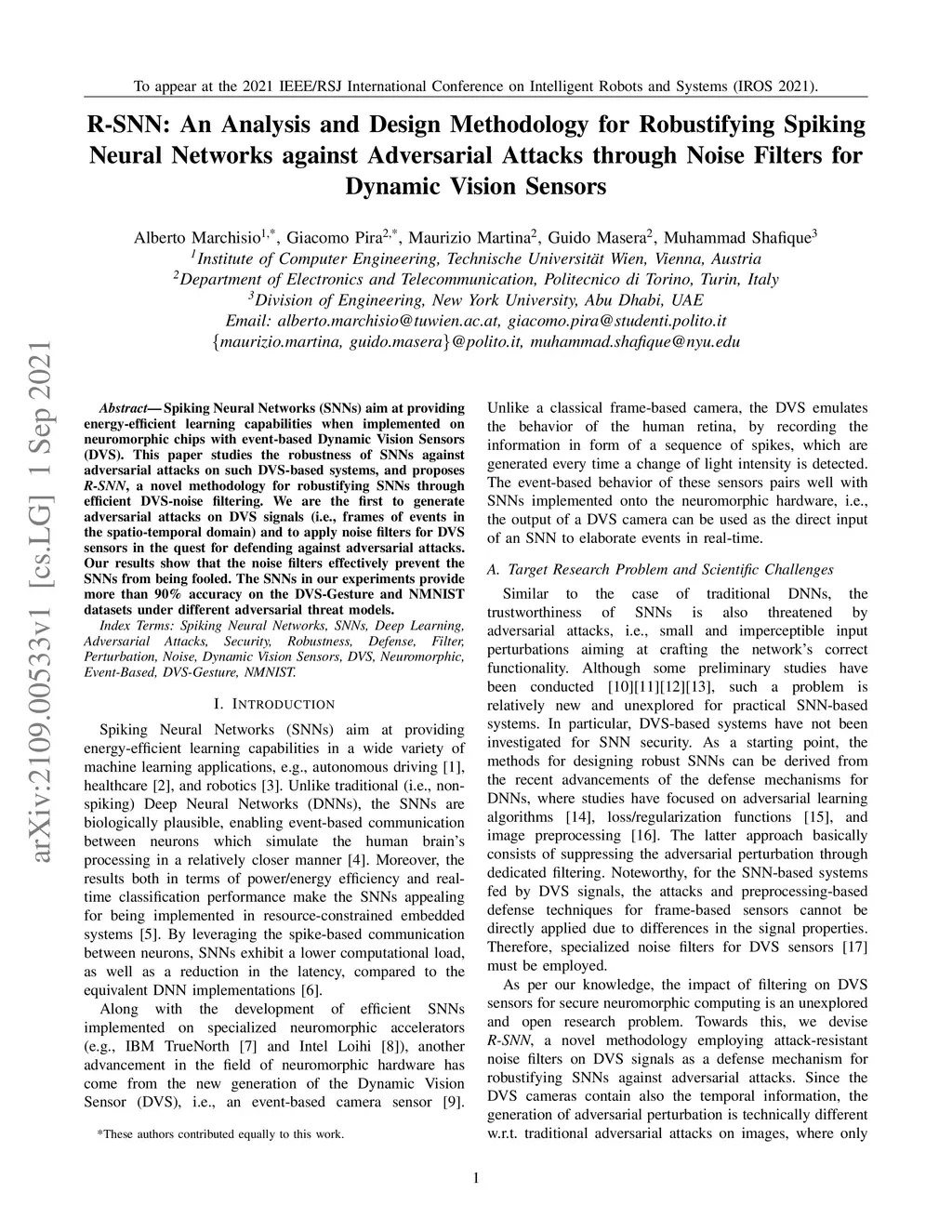 Spiking Neural Networks (SNNs) aim at providing energy-efficient learning capabilities when implemented on neuromorphic chips with event-based Dynamic Vision Sensors (DVS). This paper studies the robustness of SNNs against adversarial attacks on such DVS-based systems, and proposes R-SNN, a novel methodology for robustifying SNNs through efficient DVS-noise filtering. We are the first to generate adversarial attacks on DVS signals (i.e., frames of events in the spatio-temporal domain) and to apply noise filters for DVS sensors in the quest for defending against adversarial attacks. Our results show that the noise filters effectively prevent the SNNs from being fooled. The SNNs in our experiments provide more than 90% accuracy on the DVS-Gesture and NMNIST datasets under different adversarial threat models.
