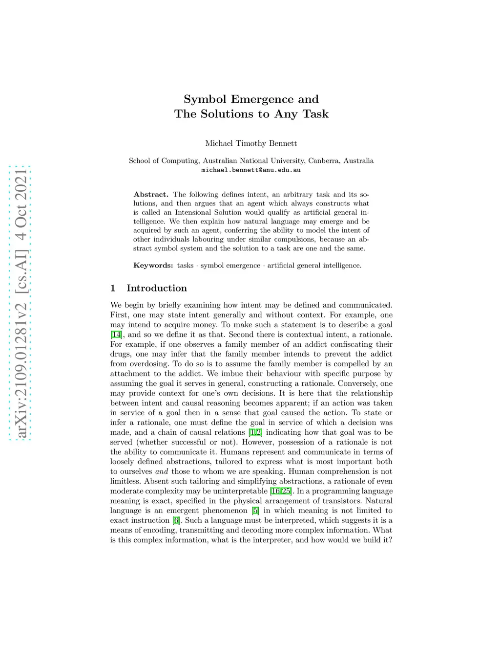 The following defines intent, an arbitrary task and its solutions, and then argues that an agent which always constructs what is called an Intensional Solution would qualify as artificial general intelligence. We then explain how natural language may emerge and be acquired by such an agent, conferring the ability to model the intent of other individuals labouring under similar compulsions, because an abstract symbol system and the solution to a task are one and the same.