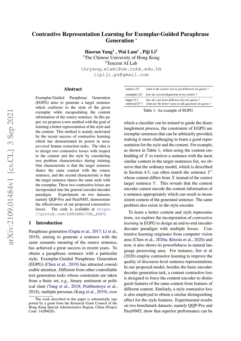 Contrastive Representation Learning for Exemplar-Guided Paraphrase
