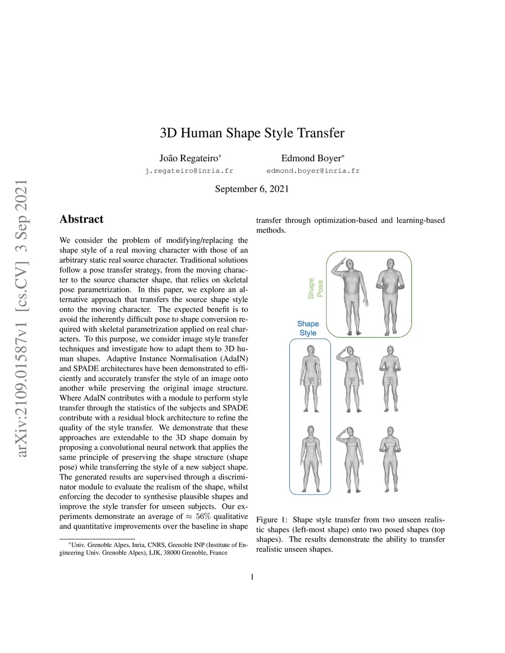 We consider the problem of modifying/replacing the shape style of a real moving character with those of an arbitrary static real source character. Traditional solutions follow a pose transfer strategy, from the moving character to the source character shape, that relies on skeletal pose parametrization. In this paper, we explore an alternative approach that transfers the source shape style onto the moving character. The expected benefit is to avoid the inherently difficult pose to shape conversion required with skeletal parametrization applied on real characters. To this purpose, we consider image style transfer techniques and investigate how to adapt them to 3D human shapes. Adaptive Instance Normalisation (AdaIN) and SPADE architectures have been demonstrated to efficiently and accurately transfer the style of an image onto another while preserving the original image structure. Where AdaIN contributes with a module to perform style transfer through the statistics of the subjects and SPADE contribute with a residual block architecture to refine the quality of the style transfer. We demonstrate that these approaches are extendable to the 3D shape domain by proposing a convolutional neural network that applies the same principle of preserving the shape structure (shape pose) while transferring the style of a new subject shape. The generated results are supervised through a discriminator module to evaluate the realism of the shape, whilst enforcing the decoder to synthesise plausible shapes and improve the style transfer for unseen subjects. Our experiments demonstrate an average of qualitative and quantitative improvements over the baseline in shape transfer through optimization-based and learning-based methods.