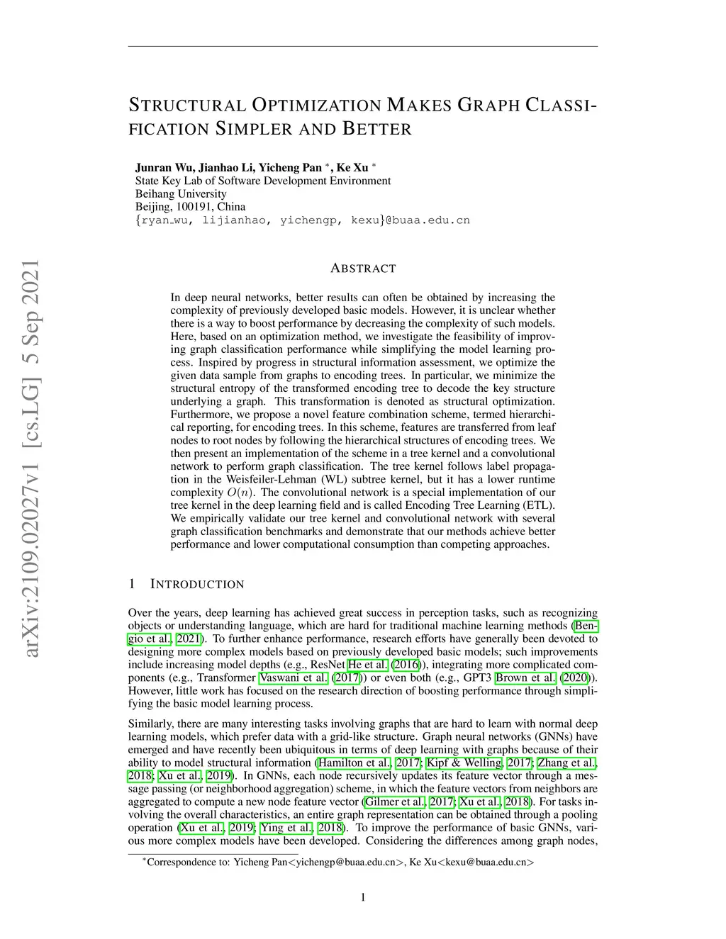In deep neural networks, better results can often be obtained by increasing the complexity of previously developed basic models. However, it is unclear whether there is a way to boost performance by decreasing the complexity of such models. Here, based on an optimization method, we investigate the feasibility of improving graph classification performance while simplifying the model learning process. Inspired by progress in structural information assessment, we optimize the given data sample from graphs to encoding trees. In particular, we minimize the structural entropy of the transformed encoding tree to decode the key structure underlying a graph. This transformation is denoted as structural optimization. Furthermore, we propose a novel feature combination scheme, termed hierarchical reporting, for encoding trees. In this scheme, features are transferred from leaf nodes to root nodes by following the hierarchical structures of encoding trees. We then present an implementation of the scheme in a tree kernel and a convolutional network to perform graph classification. The tree kernel follows label propagation in the Weisfeiler-Lehman (WL) subtree kernel, but it has a lower runtime complexity . The convolutional network is a special implementation of our tree kernel in the deep learning field and is called Encoding Tree Learning (ETL). We empirically validate our tree kernel and convolutional network with several graph classification benchmarks and demonstrate that our methods achieve better performance and lower computational consumption than competing approaches.