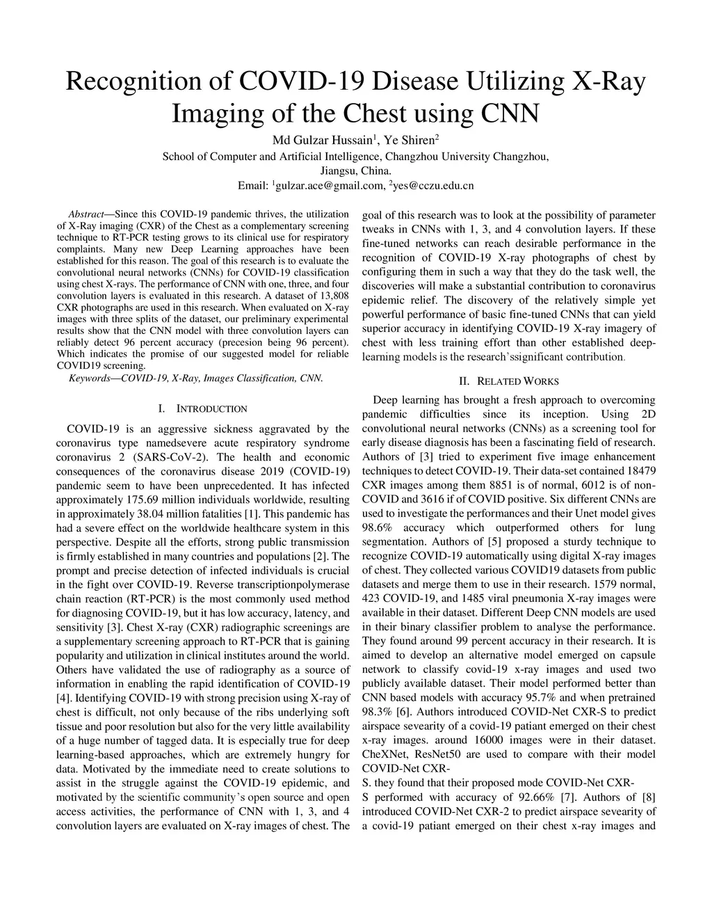 Since this COVID-19 pandemic thrives, the utilization of X-Ray images of the Chest (CXR) as a complementary screening technique to RT-PCR testing grows to its clinical use for respiratory complaints. Many new deep learning approaches have developed as a consequence. The goal of this research is to assess the convolutional neural networks (CNNs) to diagnosis COVID-19 utisizing X-ray images of chest. The performance of CNN with one, three, and four convolution layers has been evaluated in this research. A dataset of 13,808 CXR photographs are used in this research. When evaluated on X-ray images with three splits of the dataset, our preliminary experimental results show that the CNN model with three convolution layers can reliably detect with 96 percent accuracy (precision being 96 percent). This fact indicates the commitment of our suggested model for reliable screening of COVID-19.