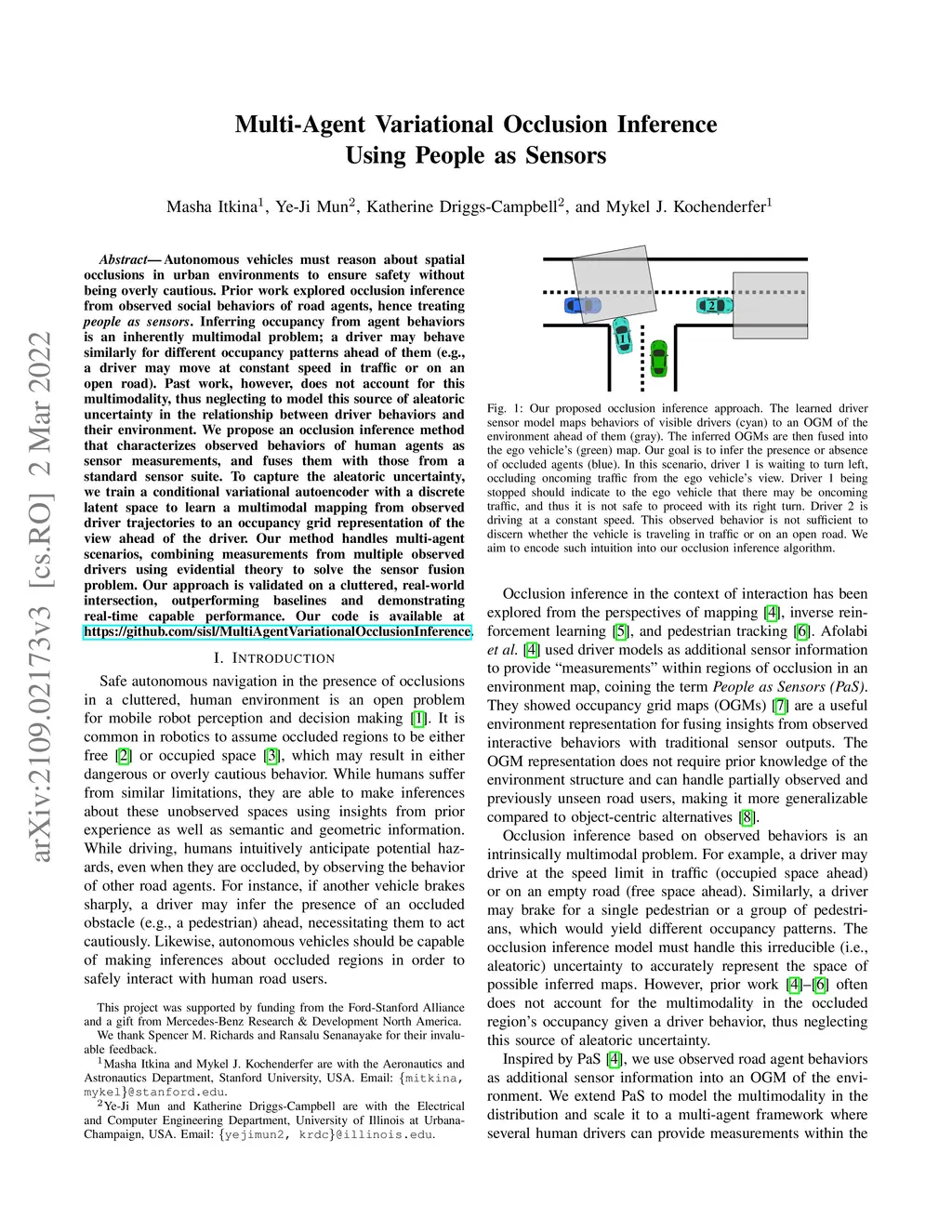 Autonomous vehicles must reason about spatial occlusions in urban environments to ensure safety without being overly cautious. Prior work explored occlusion inference from observed social behaviors of road agents, hence treating people as sensors. Inferring occupancy from agent behaviors is an inherently multimodal problem; a driver may behave similarly for different occupancy patterns ahead of them (e.g., a driver may move at constant speed in traffic or on an open road). Past work, however, does not account for this multimodality, thus neglecting to model this source of aleatoric uncertainty in the relationship between driver behaviors and their environment. We propose an occlusion inference method that characterizes observed behaviors of human agents as sensor measurements, and fuses them with those from a standard sensor suite. To capture the aleatoric uncertainty, we train a conditional variational autoencoder with a discrete latent space to learn a multimodal mapping from observed driver trajectories to an occupancy grid representation of the view ahead of the driver. Our method handles multi-agent scenarios, combining measurements from multiple observed drivers using evidential theory to solve the sensor fusion problem. Our approach is validated on a cluttered, real-world intersection, outperforming baselines and demonstrating real-time capable performance. Our code is available at https://github.com/sisl/MultiAgentVariationalOcclusionInference .