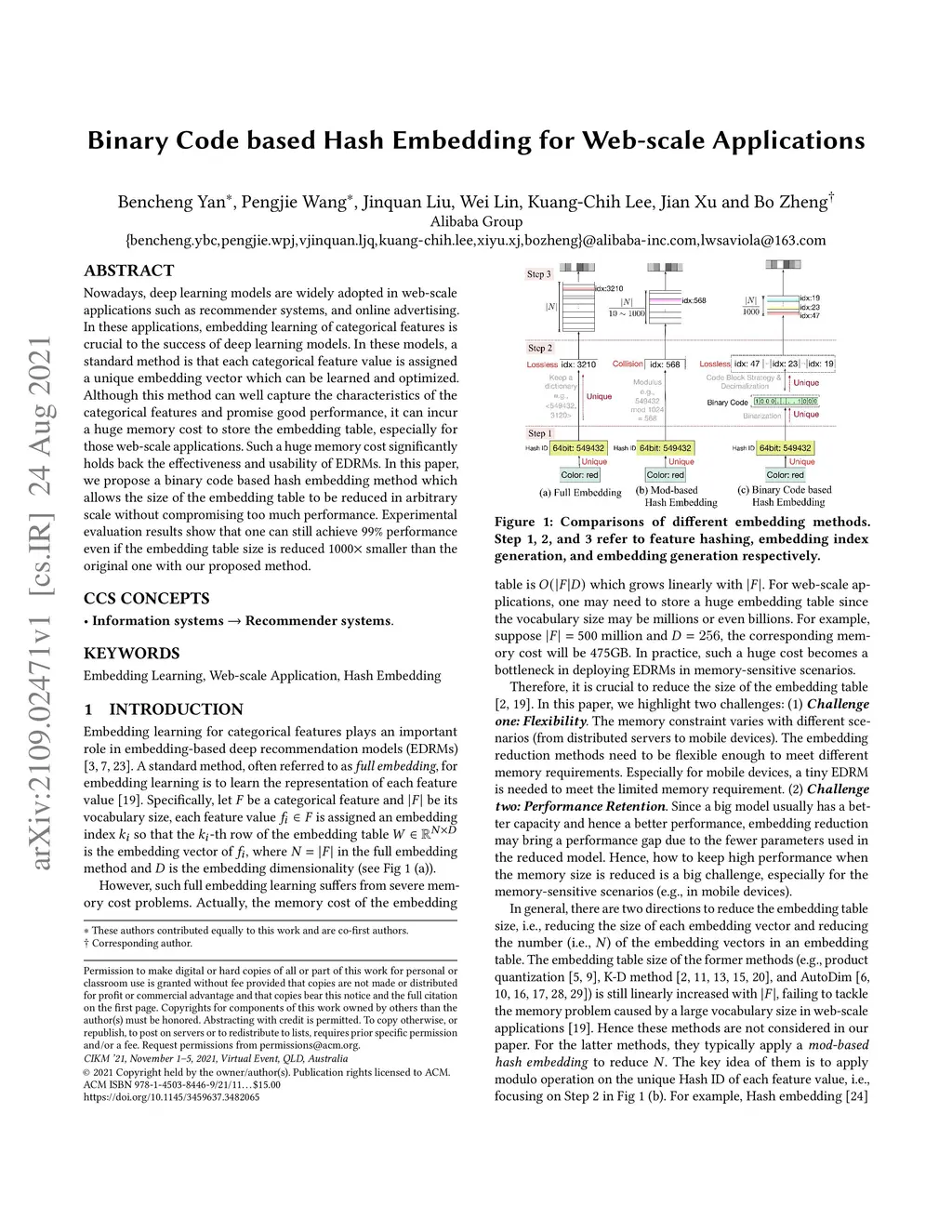 Nowadays, deep learning models are widely adopted in web-scale applications such as recommender systems, and online advertising. In these applications, embedding learning of categorical features is crucial to the success of deep learning models. In these models, a standard method is that each categorical feature value is assigned a unique embedding vector which can be learned and optimized. Although this method can well capture the characteristics of the categorical features and promise good performance, it can incur a huge memory cost to store the embedding table, especially for those web-scale applications. Such a huge memory cost significantly holds back the effectiveness and usability of EDRMs. In this paper, we propose a binary code based hash embedding method which allows the size of the embedding table to be reduced in arbitrary scale without compromising too much performance. Experimental evaluation results show that one can still achieve 99\% performance even if the embedding table size is reduced 1000 smaller than the original one with our proposed method.