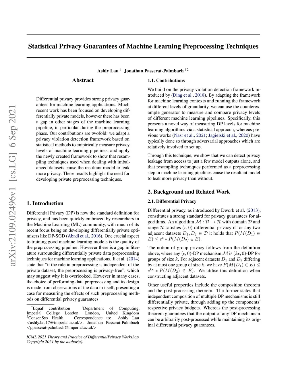 Differential privacy provides strong privacy guarantees for machine learning applications. Much recent work has been focused on developing differentially private models, however there has been a gap in other stages of the machine learning pipeline, in particular during the preprocessing phase. Our contributions are twofold: we adapt a privacy violation detection framework based on statistical methods to empirically measure privacy levels of machine learning pipelines, and apply the newly created framework to show that resampling techniques used when dealing with imbalanced datasets cause the resultant model to leak more privacy. These results highlight the need for developing private preprocessing techniques.
