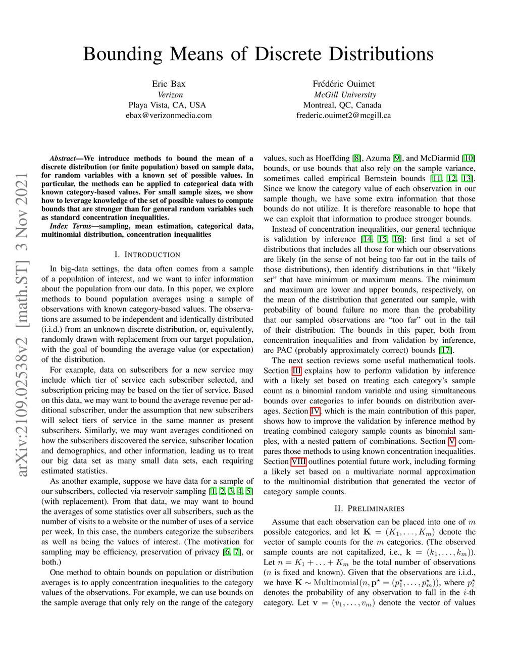We introduce methods to bound the mean of a discrete distribution (or finite population) based on sample data, for random variables with a known set of possible values. In particular, the methods can be applied to categorical data with known category-based values. For small sample sizes, we show how to leverage the knowledge of the set of possible values to compute bounds that are stronger than for general random variables such as standard concentration inequalities.