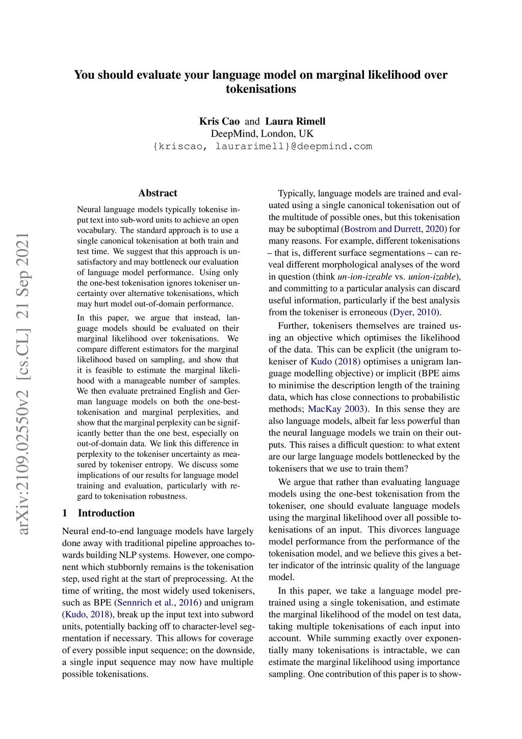 Neural language models typically tokenise input text into sub-word units to achieve an open vocabulary. The standard approach is to use a single canonical tokenisation at both train and test time. We suggest that this approach is unsatisfactory and may bottleneck our evaluation of language model performance. Using only the one-best tokenisation ignores tokeniser uncertainty over alternative tokenisations, which may hurt model out-of-domain performance. In this paper, we argue that instead, language models should be evaluated on their marginal likelihood over tokenisations. We compare different estimators for the marginal likelihood based on sampling, and show that it is feasible to estimate the marginal likelihood with a manageable number of samples. We then evaluate pretrained English and German language models on both the one-best-tokenisation and marginal perplexities, and show that the marginal perplexity can be significantly better than the one best, especially on out-of-domain data. We link this difference in perplexity to the tokeniser uncertainty as measured by tokeniser entropy. We discuss some implications of our results for language model training and evaluation, particularly with regard to tokenisation robustness.