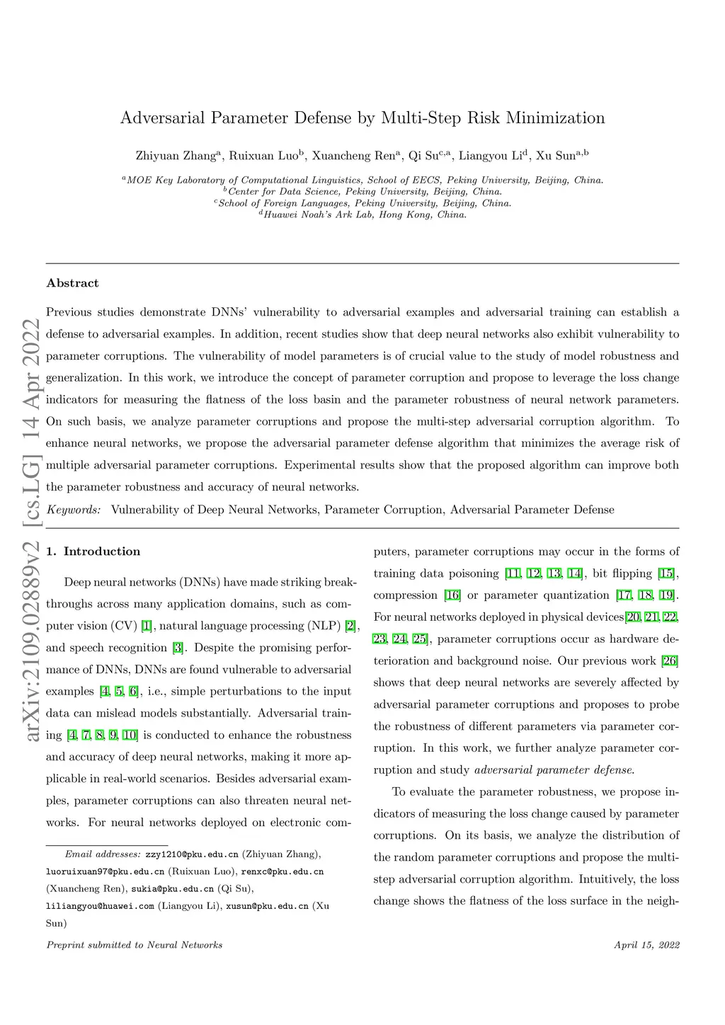 Previous studies demonstrate DNNs' vulnerability to adversarial examples and adversarial training can establish a defense to adversarial examples. In addition, recent studies show that deep neural networks also exhibit vulnerability to parameter corruptions. The vulnerability of model parameters is of crucial value to the study of model robustness and generalization. In this work, we introduce the concept of parameter corruption and propose to leverage the loss change indicators for measuring the flatness of the loss basin and the parameter robustness of neural network parameters. On such basis, we analyze parameter corruptions and propose the multi-step adversarial corruption algorithm. To enhance neural networks, we propose the adversarial parameter defense algorithm that minimizes the average risk of multiple adversarial parameter corruptions. Experimental results show that the proposed algorithm can improve both the parameter robustness and accuracy of neural networks.