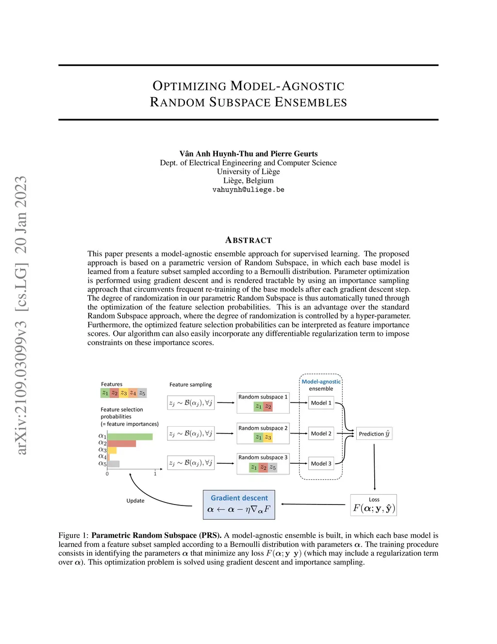 This paper presents a model-agnostic ensemble approach for supervised learning. The proposed approach is based on a parametric version of Random Subspace, in which each base model is learned from a feature subset sampled according to a Bernoulli distribution. Parameter optimization is performed using gradient descent and is rendered tractable by using an importance sampling approach that circumvents frequent re-training of the base models after each gradient descent step. The degree of randomization in our parametric Random Subspace is thus automatically tuned through the optimization of the feature selection probabilities. This is an advantage over the standard Random Subspace approach, where the degree of randomization is controlled by a hyper-parameter. Furthermore, the optimized feature selection probabilities can be interpreted as feature importance scores. Our algorithm can also easily incorporate any differentiable regularization term to impose constraints on these importance scores.