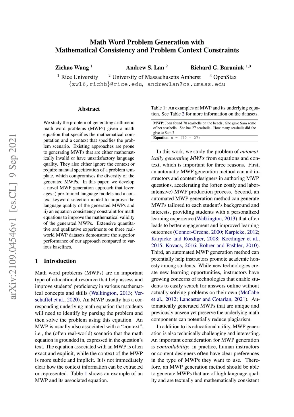We study the problem of generating arithmetic math word problems (MWPs) given a math equation that specifies the mathematical computation and a context that specifies the problem scenario. Existing approaches are prone to generating MWPs that are either mathematically invalid or have unsatisfactory language quality. They also either ignore the context or require manual specification of a problem template, which compromises the diversity of the generated MWPs. In this paper, we develop a novel MWP generation approach that leverages i) pre-trained language models and a context keyword selection model to improve the language quality of the generated MWPs and ii) an equation consistency constraint for math equations to improve the mathematical validity of the generated MWPs. Extensive quantitative and qualitative experiments on three real-world MWP datasets demonstrate the superior performance of our approach compared to various baselines.