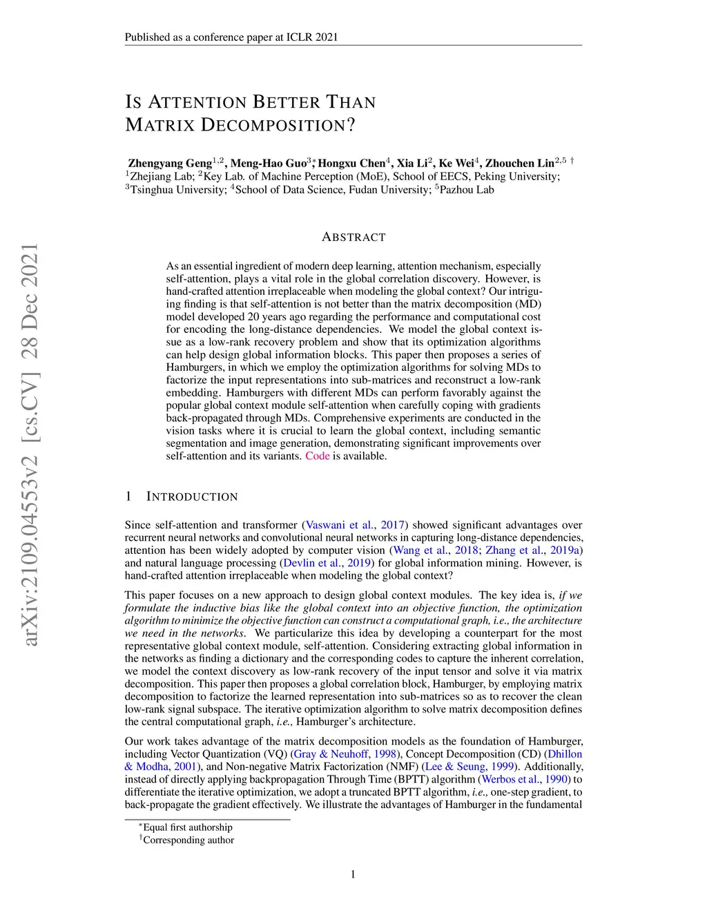 As an essential ingredient of modern deep learning, attention mechanism, especially self-attention, plays a vital role in the global correlation discovery. However, is hand-crafted attention irreplaceable when modeling the global context? Our intriguing finding is that self-attention is not better than the matrix decomposition (MD) model developed 20 years ago regarding the performance and computational cost for encoding the long-distance dependencies. We model the global context issue as a low-rank recovery problem and show that its optimization algorithms can help design global information blocks. This paper then proposes a series of Hamburgers, in which we employ the optimization algorithms for solving MDs to factorize the input representations into sub-matrices and reconstruct a low-rank embedding. Hamburgers with different MDs can perform favorably against the popular global context module self-attention when carefully coping with gradients back-propagated through MDs. Comprehensive experiments are conducted in the vision tasks where it is crucial to learn the global context, including semantic segmentation and image generation, demonstrating significant improvements over self-attention and its variants.